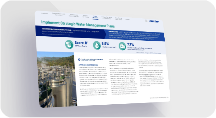 Baxter 2021 Corporate Responsibility Report 25 Protect Our Planet Corporate Responsibility Commitment Introduction 2030 Corporate Responsibility Goals Empower Our Patients Appendix Champion Our People and Communities Cross-Cutting Commitments Implement Strategic Water Management Plans Score: B * CDP Water Security *Based on 2020 data. **Compared with 2020 and indexed to revenue. 2030 CORPORATE RESPONSIBILITY GOAL : Implement strategic water management plans at prioritized manufacturing locations.* * Identify prioritized locations using a risk-based approach by the end of 2023. PERFORMANCE: In 2021, we collected data from all of our manufacturing sites, which we will use as we work toward our 2023 milestone of prioritizing locations for water management. We also continued upgrading our manufacturing infrastructure and modernizing our operations to improve efficiency and reduce operational risk moving forward. APPROACH AND PROGRESS A healthy water supply is critical for the well-being of our patients, the communities where we operate and our business. Although water management is a global concern, it must be addressed at the local and regional levels. We consider the physical, regulatory and reputational risks associated with water man - agement at our sites as we focus on opportunities to improve water efficiency in our operations, protect watersheds and provide access to clean water within local communities. In 2021, we identified and allocated the resources we should need to achieve our goal. We also engaged internal stakeholders to uncover information and processes that will advance our work in this area and to establish partnerships across Baxter as we developed our roadmap and began working toward our commitment to implement strategic water management plans. We are performing a comprehensive review of our manufacturing sites to understand the local context of each. This includes the impact that our operations, including wastewater discharge, have on the current local water supply and additional opportunities to improve our water efficiency. This information will be critical as we work to prioritize our top water management opportunities by the end of 2023. We have also started making changes that will modernize our operations and reduce water use at some of our facilities with the highest usage. These changes may increase reported water use initially due to the introduction of new equipment and processes, but they will ultimately help us mitigate water-related risks. In addition, in 2021, we continued our longstanding water management activities across the company, including efficiency and wastewater management at our manufacturing sites as well as community water projects. Baxter transparently reports the water-related impacts of our business in this report (see the following page and the Baxter Data Summary) and in our annual response to CDP Water Security , the most recent of which received a B based on 2020 data. This CDP Water Security score is in the management band and was higher than the average scores for the North America region and the Medical Equipment & Supplies Sector, both of which were B-. Apex Companies, LLC has provided assurance on the content in this section. 6.6% reduction in water use** 7.7% reduction in water use for Baxter manufacturing sites in water-stressed areas** Protect Our Planet Corporate Responsibility Commitment Introduction 2030 Corporate Responsibility Goals Empower Our Patients Appendix Champion Our People and Communities Cross-Cutting Commitments