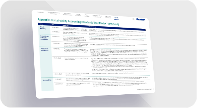 Baxter 2021 Corporate Responsibility Report 60 Appendix 2030 Corporate Responsibility Goals Corporate Responsibility Commitment Empower Our Patients Protect Our Planet Champion Our People and Communities Introduction Cross-Cutting Commitments Appendix: Sustainability Accounting Standards Board Index (continued) TOPIC CODE SASB METRIC 2021 REPORTING Ethical Marketing HC-MS-270a.1 Total amount of monetary losses as a result of legal proceedings associated with false marketing claims In 2021, Baxter had no monetary losses due to legal proceedings associated with false marketing claims that were previously reported in any company Exchange Act filings. HC-MS-270a.2 Description of code of ethics governing promotion of off-label use of products Off-label promotion is strictly prohibited at Baxter. See the Baxter Code of Conduct and the Baxter Global Interactions Policy . See Ethics and Compliance for information about the company’s approach in this area. Product Design & Lifecycle Management HC-MS-410a.1 Discussion of process to assess and manage environmental and human health considerations associated with chemicals in products, and meet demand for sustainable products See Sustainable Design , Materials Use in Products and Packaging , Materials of Concern and Striving for Full Materials Disclosure for information about the company’s approach in this area. HC-MS-410a.2 Total amount of products accepted for takeback and reused, recycled, or donated, broken down by: (1) devices and equipment and (2) supplies See Product End-of-Life for product recovery data and information about the company’s approach in this area. Supply Chain Management HC-MS-430a.1 Percentage of (1) entity’s facilities and (2) Tier I suppliers’ facilities participating in third-party audit programs for manufacturing and product quality Between 2019 and 2021, approximately 40% of Baxter’s total facilities worldwide completed third-party audits based on ISO 13485 or ISO 9001 (including through the Medical Device Single Audit Program); approximately 50% completed ministry of health or equivalent audits (depending on location) related to manufacturing and product quality; and nearly 10% completed safety marking (such as CE marking) audits. As of Dec. 31, 2021, 29% of Baxter’s Tier I suppliers had obtained third-party certification. See Continually Improve Manufacturing Capabilities and Supplier Audits for related information. HC-MS-430a.2 Description of efforts to maintain traceability within the distribution chain Baxter has a range of systems and processes to maintain traceability of materials throughout the product supply and distribution chain: • Traceability of materials from suppliers to Baxter, and throughout the manufacturing process, is maintained utilizing electronic systems. • Products manufactured by Baxter are labeled with an identifier that is traceable from the manufacturing process to the customer and may utilize barcoding and serialization technology to facilitate electronic track-and-trace capability. Enterprise resource planning (ERP) systems are used to manage traceability to the point of sale. Baxter has business agreements with our wholesalers to ensure traceability is maintained within their distribution chains, and we can access related information if needed. • Baxter maintains a range of compliance-focused initiatives to help ensure all products are labeled as required by local and regional regulations to enable traceability. See section 7.11, Product Identification and Traceability of the Baxter Supplier Quality Standard and Customs Trade Partnership Against Terrorism program content in Industry Collaboration for more information. HC-MS-430a.3 Description of the management of risks associated with the use of critical materials See Baxter’s Position Statement on Conflict Minerals and our most recent Conflict Minerals Report . Business Ethics HC-MS-510a.1 Total amount of monetary losses as a result of legal proceedings associated with bribery or corruption In 2021, Baxter had no monetary losses due to legal proceedings associated with bribery or corruption that were previously reported in any company Exchange Act filings. See Ethics and Compliance for information about the company’s approach in this area. HC-MS-510a.2 Description of code of ethics governing interactions with health care professionals See Baxter’s Global Interactions Policy and Ethics and Compliance for information about the company’s approach in this area. Baxter has adopted the AdvaMed Code of Ethics and also belongs to similar industry and professional associations around the world. See Professional Codes of Ethics and Industry Standards on Baxter’s Ethics and Compliance page for information.