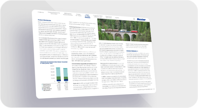 Baxter 2021 Corporate Responsibility Report 24 Protect Our Planet Corporate Responsibility Commitment Introduction 2030 Corporate Responsibility Goals Empower Our Patients Appendix Champion Our People and Communities Cross-Cutting Commitments Product Distribution Baxter transports more than 5 million metric tons of raw materials and finished goods each year, primarily in partnership with third-party vendors and carriers. Only a small portion of product transportation–related GHG emissions are Scope 1 and therefore covered by our carbon neutrality goal. However, we continue to measure and manage all emissions (including Scope 3) across our global supply chain. Our worldwide GHG emissions from product transport totaled 425,800 metric tons CO 2 e in 2021. 11 This is equivalent to 84 kilograms CO 2 e per metric ton of products transported, a decrease of 5.6% compared with 2020. This decrease was primarily due to a reduction in air freight associated with prioritizing quick delivery of renal supplies and other Baxter products urgently needed during the COVID-19 pandemic, though these shipments did continue to keep air freight higher than pre-pandemic levels. Of these emissions, 17,100 metric tons CO 2 e are Scope 1 emissions attributed to our distribu - tion vehicles and covered by our carbon neutrality goal. Baxter’s approach to improving efficiency and decreasing emissions from product transport includes: Technology innovation: In 2021, the primary transpor - tation service provider utilized by Baxter for our UK customers began replacing fossil fuels with biofuel. This conversion helped reduce GHG emissions associ- ated with our UK transportation activities by more than 2,000 metric tons CO 2 e in 2021 and is expected to reduce GHG emissions by about 4,000 metric tons CO 2 e on an annual basis. 12 We also started using biofuel for our distribution activities in Brazil, specifically in the regions of Minas Gerais, Espirito Santo and the countryside of São Paulo. The switch to biofuel helped us reduce our GHG emissions by approximately 300 metric tons CO 2 e in 2021. In addition, for export shipments out of Europe, we implemented a project to shift 700 temperature- controlled shipping containers per year to standard, non-temperature-controlled containers. We estimate this will reduce associated GHG emissions by more than 1,000 metric tons CO 2 e annually. 12 Environmentally responsible partnerships: Baxter participates in the U.S. Environmental Protection Agency’s SmartWay program as both a Carrier and Shipper Partner. We also participate in the Clean Cargo initiative, which focuses on environmentally responsible ocean shipping. Baxter uses EcoTransIT software and methodology to capture and report our emissions data in alignment with industry bes t practices. These partnerships help Baxter calculate our transportation emissions with greater accuracy. Modal shift: In 2021, we changed the default mode of transport for our elastomeric infusion pumps from air to sea between the United States and Europe, decreasing costs and GHG emissions. Congestion in some U.S. ports prevented conversion of all shipments, but we expect to expand this practice in future years. The temporary obstruction of the Suez Canal in 2021 significantly delayed ocean shipments between Europe and Asia and impacted global supply chains. As Baxter worked to mitigate supply disruptions for our customers and patients, we shipped more than 1,200 metric tons of products by rail instead of air between Europe and China. This helped us avoid an additional 8,000 metric tons CO 2 e of GHG emissions that would have occurred if those products had instead been shipped by air. Optimizing the distribution network: The majority of our EMEA export shipments pass through our ocean export consolidation center in Antwerp, Belgium, where shipments from different warehouses throughout Europe are combined to ensure optimized loads. This reduces the total number of containers shipped and saves money while increasing supply frequency. In addition, we are moving production for some products closer to the markets those products serve. For example, we began producing hemodialysis products bound for our European market in Malta rather than in Mexico. In 2021, we improved the pallet configuration for transportation of our renal solutions manufactured in Canlubang, Philippines, and transported to India and Thailand. Transporting more products per pallet results in fewer containers; we expect this to reduce GHG emissions by about 60 metric tons CO 2 e annually. 12 MOVING FORWARD >> Technology transformation across Baxter will support a more refined understanding of our GHG emissions and help us drive progress and capitalize on the growing demand for lower-carbon healthcare products. As we work to cut our own GHG emissions over the next decade, we will continue to prioritize energy efficiency initiatives and renewable electricity use, including purchased electricity and on-site projects, such as biomass. For example, we are planning to install cogeneration to supply electricity to two of our manufacturing facilities in Puerto Rico. In addition to providing the sites with a less carbon intensive source of electricity, these projects will make the sites more resilient to disruptions in service from the local utility due to extreme weather events, such as Hurricane Maria in 2017. We will also consider other alternative fuel sources as innovation in this area advances. We are actively evaluating our ability to report against the Task Force on Climate-related Financial Disclosures (TCFD) framework generally and in light of potential evolving regulatory disclosure requirements. WORLDWIDE GHG EMISSIONS FROM PRODUCT TRANSPORT BY MODE ( METRIC TONS ) Road (Scope 1) 15,200 17,100 Road (Scope 3) 277,300 263,100 Air (Scope 3) 105,800 84,500 Ocean (Scope 3) 38,500 46,900 Rail (Scope 3) 12,800 14,200 0 100,000 200,000 300,000 400,000 500,000 2020 2021