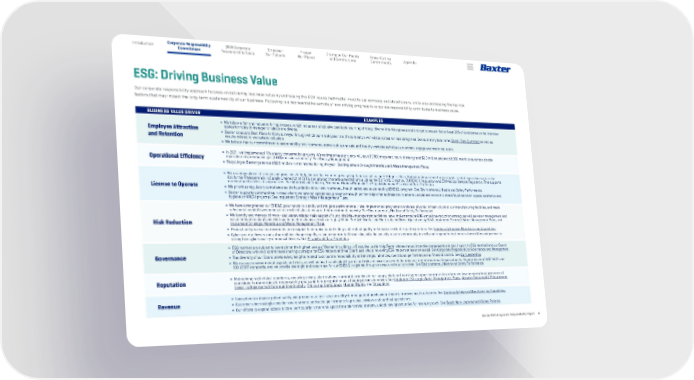 Baxter 2021 Corporate Responsibility Report 9 Corporate Responsibility Commitment 2030 Corporate Responsibility Goals Empower Our Patients Protect Our Planet Appendix Champion Our People and Communities Introduction Cross-Cutting Commitments ESG: Driving Business Value Our corporate responsibility approach focuses on delivering business value by addressing the ESG issues that matter most to our company and stakeholders, while also addressing the key risk factors that may impact the long-term sustainability of our business. Following is a representative sample of how driving progress in corporate responsibility contributes to business value. BUSINESS VALUE DRIVER EXAMPLES Employee Attraction and Retention • We follow a fair and inclusive hiring process, which includes an inclusive candidate sourcing strategy, diverse interview panels and a target to ensure that at least 30% of candidates on the interview slates for roles of manager or above are diverse. • Baxter conducts Best Place to Work surveys, through which our employees rate the company’s workplace across various categories. See summary data in the Baxter Data Summary as well as results related to workplace inclusion. • We believe that our commitment to sustainability, environmental stewardship, and safe and healthy workplaces helps us to attract, engage and retain top talent. Operational Efficiency • In 2021, we implemented 196 energy conservation projects. We estimate these projects will save 33,800 megawatt hours of energy and $3.3 million and avoid 8,800 metric tons carbon dioxide equivalent of greenhouse gas (GHG) emissions annually. 1 See Energy Management. • Recycling at Baxter generated $2.5 million in net income during the year. See Implement Strategic Materials and Waste Management Plans. License to Operate • We maintain global strategies and programs to help ensure that we meet privacy regulations such as the EU General Data Protection Regulation; human rights-related legislation such as the California Transparency in Supply Chains Act of 2010; and product materials restrictions such as the EU RoHS Directive, EU REACH Regulation and EU Medical Devices Regulation. This supports our continued access to key markets. See Materials of Concern, Protecting Human Rights in Our Supply Chain and Privacy and Data Protection. • We prioritize regulatory compliance as the foundation of our environmental, health, safety and sustainability (EHS&S) program. See Environmental, Health and Safety Performance. • Baxter supports communities in need where we have an operational presence through partnerships that address environmental, social and economic needs (such as water access, sanitation and hygiene or WASH projects). See Implement Strategic Water Management Plans. Risk Reduction • We have strengthened our EHS&S governance to identify and mitigate environmental risks; implemented programs to enhance physical infrastructure at our manufacturing facilities; and made substantial capital investments at our critical sites to ensure their operational longevity. See Environmental, Health and Safety Performance. • We identify and manage climate- and water-related risks as part of our global risk management activities, have implemented a GHG emissions-reduction strategy as well as water management and waste mitigation plans and continue to build resiliency across our supply chain. See Achieve Carbon Neutrality for Direct Operations by 2040, Implement Strategic Water Management Plans, and Implement Strategic Materials and Waste Management Plans. • Product and process improvements are designed to enhance patient safety and product quality and decrease risk of regulatory actions. See Continually Improve Manufacturing Capabilities. • Cybersecurity threats and vulnerabilities change rapidly, so we are committed to working with the security research community to verify and respond to legitimate vulnerabilities and partner to strengthen cybersecurity of medical devices. See Privacy and Data Protection. Governance • ESG matters are subject to oversight at the highest levels of Baxter, including our Executive Leadership Team (whose annual incentive compensation is tied, in part, to ESG metrics) and our Board of Directors (with two committees sharing oversight for ESG matters and the Board as a whole reviewing ESG matters at least annually). See Corporate Responsibility Governance and Management. • The diversity of our Board provides key insights related to corporate responsibility and strategic initiatives, operational performance and financial control. See Our Leadership. • We manage environmental aspects and risks, as well as health and safety hazards and risks, in accordance with the most current International Organization for Standardization (ISO) 14001 and ISO 45001 standards, and we provide oversight and assurance for our EHS&S programs through a structured audit process. See Environmental, Health and Safety Performance. Reputation • Maintaining high ethical standards, ensuring strong labor and environmental practices in our supply chain and working to support communities where we have an operational presence all contribute to our corporate responsibility goals and to our reputation as a leading corporate citizen. See Implement Strategic Water Management Plans, Advance Sustainable Procurement, Invest in Underserved Communities Globally , Ethics and Compliance, Human Rights, and Recognition. Revenue • Innovation to enhance patient safety and product quality drives our ability to meet patient needs and ultimately improves health outcomes. See Continually Improve Manufacturing Capabilities. • Customers increasingly consider environmental and social performance in proposal reviews and purchasing decisions. • Our efforts to expand access to care, particularly in the renal space for underserved markets, unlock new opportunities for revenue growth. See Reach More Underserved Kidney Patients.