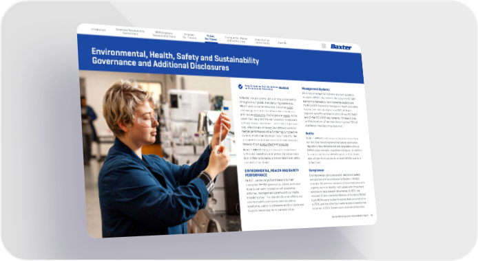 Baxter 2021 Corporate Responsibility Report 33 Protect Our Planet Corporate Responsibility Commitment Introduction 2030 Corporate Responsibility Goals Empower Our Patients Appendix Champion Our People and Communities Cross-Cutting Commitments At Baxter, we are committed to driving sustainability throughout our global manufacturing operations. 1 We strive to conserve resources, including water and energy , minimize use of hazardous chemicals, and reduce emissions, discharges and waste . At the same time, we prioritize environmental compliance and operational excellence. These efforts have been cost-effective and enhance the company’s environ - mental performance while furthering our objective to be an environmental leader in our industry. We also work to identify and reduce the environmental impacts of our supply chain and products. Baxter’s EHS&S Policy outlines our commitment within our operations and across the value chain to prioritize compliance, promote health and safety, and protect the planet. ENVIRONMENTAL, HEALTH AND SAFETY PERFORMANCE In 2021, we took significant steps to further strengthen EHS&S governance, adding dedicated roles to our team focused on our assurance activities, management systems and our digital transformation. This new structure re-affirms our commitment to compliance and operational excellence, supports achievement of our goals and helps to create long-term business value. Management Systems We follow a management systems approach guided by our global EHS&S requirements. We apply the ISO 14001 standard to manage our environmental aspects and the ISO 45001 standard to manage our health and safety hazards and risks. As of year-end 2021, 62 Baxter locations were ISO certified, of which 61 met ISO 14001 and 45 met ISO 45001 requirements. Of these 62 total certified locations, 47 are manufacturing sites (78% of total Baxter manufacturing locations 2 ). Audits Baxter’s EHS&S audit program helps to ensure that our facilities have programs that satisfy applicable regulatory requirements and are consistent with our EHS&S requirements, objectives and goals. In addition to conducting internal EHS&S audits in 2021, Baxter also utilized third parties to conduct EHS&S audits in 26 facilities. 3 Compliance Environmental compliance and health and safety compliance are foundational to Baxter’s EHS&S program. We address instances of noncompliance with urgency, work to identify root causes and implement controls to help prevent recurrence. In 2021, we received 12 environmental Notices of Violation (NOVs). Eight NOVs were related to events that occurred prior to 2021, and the other four were related to events that occurred in 2021. Eleven were received at facilities Environmental, Health, Safety and Sustainability Governance and Additional Disclosures Apex Companies, LLC has provided assurance on the content in this section.