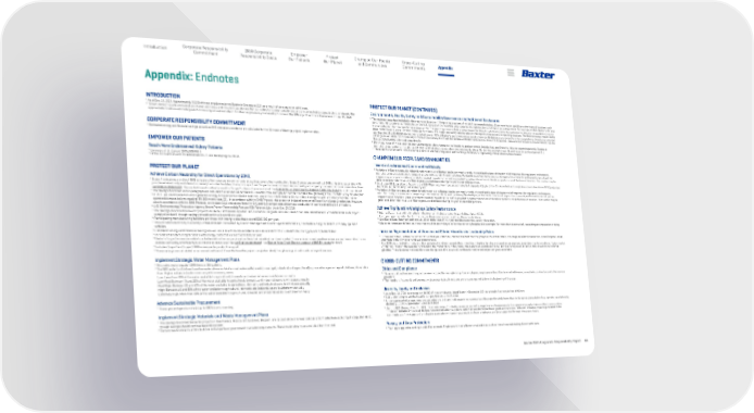 Baxter 2021 Corporate Responsibility Report 63 Appendix 2030 Corporate Responsibility Goals Corporate Responsibility Commitment Empower Our Patients Protect Our Planet Champion Our People and Communities Introduction Cross-Cutting Commitments INTRODUCTION 1 As of Dec. 31, 2021. Approximately 10,000 of those employees joined Baxter in December 2021 as a result of our acquisition of Hillrom. 2 “Smart device” counts are based on internal estimates and include those devices that can collect and communicate data and are connected or connectable to a network. The approximate 2 million estimate (post-Hillrom acquisition) includes 1.3 million as previously disclosed by Hillrom at the JPMorgan Healthcare Conference on Jan. 15, 2020. CORPORATE RESPONSIBILITY COMMITTMENT 1 Estimated energy and financial savings as well as GHG emissions avoidance are calculated for the 12 months following project implementation. EMPOWER OUR PATIENTS Reach More Underserved Kidney Patients 1 Liyanage, et al. Lancet . 2015; 385(9981) 2 Of the 30 countries with PD Ambassadors, 21 are developing countries. PROTECT OUR PLANET Achieve Carbon Neutrality for Direct Operations by 2040 1 Scope 1 emissions are direct GHG emissions from sources we own or control, such as on-site fuel combustion. Scope 2 emissions are indirect GHG emissions associated with purchased electricity and steam for owned/controlled facilities. Baxter’s Scope 1 and Scope 2 emissions have been verified by a third party to a reasonable assurance level (see verification statement ). The market-based method is used for Scope 2 unless otherwise stated. See Baxter Value Chain Energy Usage and GHG Emissions for additional detail. 2 The savings described in this paragraph are calculated on an annualized basis (12 months from each project completion date), though savings should continue beyond one year. 3 In 2021, we used biomass fuels to generate energy in boilers at two Baxter locations: one in the United States and one in Italy. During the year, emissions from the Baxter- operated biomass boilers equaled 151,000 metric tons CO 2 . In accordance with the GHG Protocol, these are not included in reported Scope 1 and Scope 2 emissions. However, also in accordance with the GHG Protocol, we include CO 2 e emissions from the CH 4 and N 2 O components of biomass combustion in our reported Scope 1 emissions. 4 U.S. Environmental Protection Agency Green Power Partnership Fortune 500 Partners List. As of Oct. 25, 2021. 5 The savings described below for projects in Haina, Dominican Republic, and Lessines, Belgium, are calculated on an annualized basis (12 months from each project completion date), though savings should continue beyond one year. 6 Participating manufacturing facilities are those with energy costs that exceed $200,000 per year. 7 This includes electricity, fuel and purchased steam consumed by Baxter-managed and Baxter-operated facilities; it excludes energy related to company-operated vehicles. 8 Estimated energy and financial savings as well as GHG emissions avoidance are calculated for the 12 months following project implementation. 9 Includes manufacturing facilities with energy costs that exceed $200,000 per year. 10 Baxter’s Scope 3 emissions relate to activities within the company’s value chain, but outside of our direct control. These emissions are based on various assumptions and estimates and are verified by a third party to a limited assurance level (see verification statement ). See Baxter Value Chain Energy Usage and GHG Emissions for detail . 11 Includes Scope 1 and Scope 3 GHG emissions for product transport. 12 These savings are calculated on an annualized basis (12 months from the project completion date), though savings should continue beyond one year. Implement Strategic Water Management Plans 1 One cubic meter equals 1,000 liters or 264 gallons. 2 The WRI water tool defines baseline water stress as total annual water withdrawals (municipal, industrial and agricultural) expressed as a percentage of total annual available flow. Higher values indicate more competition among users. Low: Less than 10% of the water available to agricultural, domestic and industrial users is withdrawn annually. Low-Med: Between 10 and 20% of the water available to agricultural, domestic and industrial users is withdrawn annually. Med-High: Between 20 and 40% of the water available to agricultural, domestic and industrial users is withdrawn annually. High: Between 40 and 80% of the water available to agricultural, domestic and industrial users is withdrawn annually. Extremely High: More than 80% of the water available to agricultural, domestic and industrial users is withdrawn annually. Advance Sustainable Procurement 1 These percentages do not add up to 100% due to rounding. Implement Strategic Materials and Waste Management Plans 1 The savings described below for projects in Cuernavaca, Mexico, and Lessines, Belgium, are calculated on an annualized basis (12 months from each project completion date), though savings should continue beyond one year. 2 Certain waste streams at two facilities in Europe have government-mandated requirements. These waste streams are excluded from the total. Appendix: Endnotes PROTECT OUR PLANET ( CONTINUED ) Environmental, Health, Safety and Sustainability Governance and Additional Disclosures 1 The environmental data included in this report are based on 119 reporting locations, of which 51 are manufacturing, 20 are warehouse, and 48 are other types of locations, such as compounding centers, administrative or clerical. Several of the reporting units comprise multiple locations that report as a single entity. For example, in 2021, Baxter’s 45 renal therapy sites in Colombia reported as a single entity. The reporting scope excludes certain leased facilities for which environmental performance data are not available or are not material to Baxter’s overall environmental performance. The health and safety data included in th