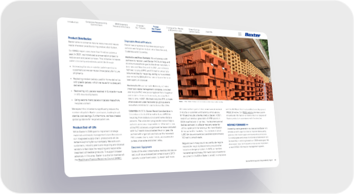 Baxter 2021 Corporate Responsibility Report 32 Protect Our Planet Corporate Responsibility Commitment Introduction 2030 Corporate Responsibility Goals Empower Our Patients Appendix Champion Our People and Communities Cross-Cutting Commitments Product Distribution Baxter aims to conserve natural resources and reduce waste wherever possible during product distribution. Our EMEA region uses more than 1 million pallets a year. In 2021, we introduced a conservation project to reduce cost and pallet turnover. This initiative increases pallet circularity and extends pallet life through: • Increasing the return rate for pallets we ship to customers so we can reuse those pallets for future shipments • Replacing wooden pallets used for home deliveries with plastic pallets, which we reuse for subsequent deliveries • Recovering U.S. pallets received in Europe for reuse in U.S.-bound shipments • Using second-hand pallets or pallets made from recycled content We expect this initiative to significantly reduce the number of pallets Baxter purchases, leading to sub- stantial cost savings. Furthermore, we have created global guidance for recycled pallet use. Product End-of-Life While Baxter’s 2030 goal to implement strategic materials and waste management plans focuses on our integrated supply chain, product end-of-life remains a priority for our company. We work with customers, industry peers and recycling and disposal vendors to facilitate the recycling and responsible treatment of medical products. To support broader advances in this area, Baxter is a charter member of the Healthcare Plastics Recycling Council (HPRC). Disposable Medical Products Baxter has programs to facilitate recycling for patients and hospitals in Australia, New Zealand, Guatemala and Colombia. Australia and New Zealand: We collaborate with partners to recover used Baxter PVC fluid bags and aluminum anesthetic gas bottles from hospitals in Australia and New Zealand. In 2021, we collected 140 metric tons of PVC and 0.5 metric tons of alu - minum bottles for recycling, saving our customers approximately $106,000 that would have otherwise been spent on disposal. Guatemala: We partner with Biotrash, a Central American waste management company, to collect and recycle PVC and polypropylene from hospitals and dialysis clinics in Guatemala, equaling 15.3 metric tons in 2021. Biotrash recycles PVC to make shoe soles and uses recovered polypropylene to manufacture bricks for use in its own facilities. Colombia: In 2021, Baxter Renal Care Services in Colombia collected 69.4 metric tons of PVC for recy cling from dialysis clinics and home dialysis patients. The collection program for home dialysis patients alone was responsible for 38.4 metric tons of the PVC collected, a significant increase compared with 14.7 metric tons collected the prior year. We partner with organizations that use the recovered PVC to make chairs, water hoses, accessories for purses, shoe soles and other items. Electronic Equipment Some of the electromechanical medical devices we sell, such as automated peritoneal dialysis (APD) cyclers, support serviceability, repair and reuse. We lease certain types of electromechanical medical products to customers and patients, which allows for those products to be returned to Baxter. In 2021, most of our previous generation of APD cyclers in EMEA reached end-of-service. The decommissioned devices were sent to a Baxter recovery center for critical spare parts harvesting or for recertification for reuse in other markets. This recovery of about 6,200 devices and spare parts avoided approximately 105 metric tons of waste. Regulations in many countries worldwide require responsible recycling of electronic products when reuse is no longer an option. In 2021, our vendors recovered approximately 110 metric tons of electronic equipment in the EU on Baxter’s behalf, in compliance with the EU Waste Electrical and Electronic Equipment (WEEE) Directive. Our WEEE website provides custom- ers detailed information on how to return or dispose of Baxter products in accordance with the directive. MOVING FORWARD >> Assessing waste generation sources across Baxter will provide us with opportunities to improve data quality, address information gaps and standardize processes. Our employees and cross-functional collaboration will be essential in striving toward our 2030 waste goal. We also expect near-term opportunities as we implement a new EHS&S information management system. Photo: Plastic pallets manufactured with Baxter’s plastic scrap in Valtellina, Italy.