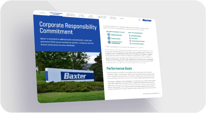 Baxter 2021 Corporate Responsibility Report 8 Corporate Responsibility Commitment 2030 Corporate Responsibility Goals Empower Our Patients Protect Our Planet Appendix Champion Our People and Communities Introduction Cross-Cutting Commitments Corporate Responsibility Commitment Baxter is committed to addressing the environmental, social and governance (ESG) issues touching our patients, employees and the diverse communities we serve worldwide. Our corporate responsibility work is grounded in three pillars and bolstered by our approach to good governance and cross-cutting commitments to responsible practices across our business. Our 2030 Corporate Responsibility Commitment features 10 goals for prioritized action. We have reported our environmental performance for 30 years and have consistently broadened and enhanced our reporting on the ESG issues that are priorities to Baxter and our stakeholders. Baxter published its first Sustainability Accounting Standards Board (SASB) Index in 2020 (based on 2019 information), in alignment with the Medical Equipment and Supplies Sustainability Accounting Standard. In addition, in early 2022, we commissioned a third party to conduct a gap analysis comparing the information in our 2020 Corporate Responsibility Report and our 2021 CDP Climate Change disclosure with the Task Force on Climate-related Financial Disclosures (TCFD) framework. We are actively evaluating our ability to report against the TCFD framework generally and in light of potential evolving regulatory disclosure requirements. Performance Goals Every year, we measure and evaluate our performance, communicate progress and challenges, and identify opportunities to drive even greater impact across our business and society. Setting goals across a broad range of ESG issues demonstrates our commitment, reinforces accountability and helps to drive ongoing improvement. This report states progress toward Baxter’s 2030 Corporate Responsibility Goals. We developed our 2030 goals through broad engagement with Baxter executives, our Board of Directors (Board) , subject matter experts across the company, investors, nongovernmental organizations and other external stakeholders. Industry and cross-industry benchmarking, as well as our most recent materiality assessment, also informed the process. Given the scale and scope of the challenges we face as a society, we chose a 10-year timeframe for most of our goals to advance meaningful progress related to these substantive issues. CORPORATE RESPONSIBILITY PILLARS Empower Our Patients Protect Our Planet Champion Our People and Communities CROSS-CUTTING COMMITMENTS Ethics and Compliance Human Rights Diversity, Equity and Inclusion Privacy and Data Protection