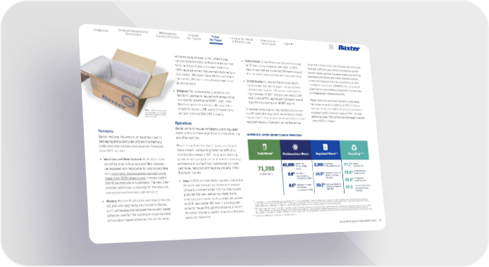 Baxter 2021 Corporate Responsibility Report 31 Protect Our Planet Corporate Responsibility Commitment Introduction 2030 Corporate Responsibility Goals Empower Our Patients Appendix Champion Our People and Communities Cross-Cutting Commitments Packaging Baxter reduces the amount of materials used in packaging and substitutes with environmentally preferable alternatives when possible. Examples from 2021 include: 1 • Australia and New Zealand: At all of our com - pounding sites in Australia and New Zealand, we replaced non-recyclable foil and polystyrene with recyclable, biodegradable package lining made from 100% sheep’s wool in boxes used to distribute products to customers. The new liner provides additional cushioning for the products and protection from heat and moisture. • Mexico: For our IV solutions and renal products (6L and twin bag) being distributed in Mexico, our Cuernavaca site replaced the solvent-based adhesive used for the cardboard shipping boxes with a water-based adhesive. For our 6L renal solutions being shipped to the United States, the site replaced virgin cardboard boxes sourced from the United States with boxes made from 100% recycled content that are manufactured by a local vendor. We expect these efforts to eliminate the use of 1,396 metric tons of virgin material on an annual basis. • Belgium: We implemented a project at our facility in Lessines to reduce the thickness of the low-density polyethylene (LDPE) liner in the Nutrition product carton box. We expect this project to reduce LDPE use by 57 metric tons per year and save $165,000 annually. Operations Baxter works to reduce nonhazardous and regulated waste, and to increase recycling at our manufacturing and office facilities. Plastic scrap from manufacturing was our largest waste stream, representing more than 40% of our nonhazardous waste in 2021. As a result, reducing plastic scrap is a significant priority for our company and several of our facilities implemented or contin - ued reuse, reduction and recycling projects in 2021. Examples include: • Italy: In 2020, our manufacturing sites in Valtellina (Grosotto and Sondalo) partnered with a waste company to convert scrap film into small plastic granules that are used as raw materials to produce plastic items, such as boxes and pallets. In 2021, we diverted 182 metric tons of plastic scrap for reuse through this initiative, of which 28 metric tons were used for production of plastic pallets for Valtellina. • Switzerland: In San Vittore, we reduced film scrap by 70 metric tons compared with 2020. In 2021, the site captured and converted 930 metric tons of film into plastic granules that were sold externally. • United States: Our Marion (North Cove), North Carolina, facility captures plastic scrap and then regrinds and recycles it for reuse in manufactur - ing processes. In 2021, the site used nearly 2,500 metric tons of PVC regrind and 168 metric tons of high-density polyethylene (HDPE) regrind. To manage waste disposal appropriately and to com - ply with applicable regulatory requirements, Baxter requires facilities to dispose of all hazardous or other regulated waste at disposal sites that Baxter has inspected or from which the company has otherwise received sufficient assurance of acceptable perfor - mance. Baxter applies the same waste site auditing standards worldwide and trains internal auditors to evaluate disposal site risk consistently. In addi - tion, Baxter works with CHWMEG, Inc., a nonprofit organization that enables companies to collectively purchase expert waste site audits. Waste reduction and recycling help us decrease the waste we send to landfills. In 2021, 21 of our manufacturing sites 2 (41% of the total) achieved or exceeded landfill diversion rates of 95%. Thirteen additional sites (25% of the total) achieved diversion rates of 80% or higher. BAXTER 2021 WASTE AND RECYCLING IN OPERATIONS * Total waste includes nonhazardous and regulated waste. To more closely reflect production efficiency and support consistent evaluation of facility performance and trends, we exclude certain nonroutine, nonproduction-related waste streams from our total waste performance data. These waste streams are construction and demolition debris, remediation waste, wastewater treatment sludge and discarded manufacturing and process-related machinery or equipment. ** We report “regulated waste” rather than “hazardous waste.” This term includes some materials that would otherwise be classified as nonhazardous waste in some countries, which helps Baxter harmonize waste reporting across locations. In addition to waste typically considered hazardous (such as toxics and corrosives), we also include oils, biohazardous or infectious materials, batteries, fluorescent lamps and other materials that may not be defined as hazardous waste by national legislation at the point of origin. *** Incineration with energy recovery is considered recycling. 71,200 metric tons Total Waste * Nonhazardous Waste Regulated Waste ** 5,300 metric tons (7.5% of total waste) 14.0 % decrease in absolute terms, compared with 2020 20.2 % decrease indexed to revenue, compared with 2020 65,900 metric tons (92.5% of total waste) 0.9 % decrease in absolute terms, compared with 2020 8.0 % decrease indexed to revenue, compared with 2020 Recycling *** 79.6 % of nonhazardous waste recycled 77.1 % overall recycling rate 48.6 % of regulated waste recycled $2.5 million in net income generated through recycling Photo: Wool liners protect and insulate compounded products in Australia and New Zealand.