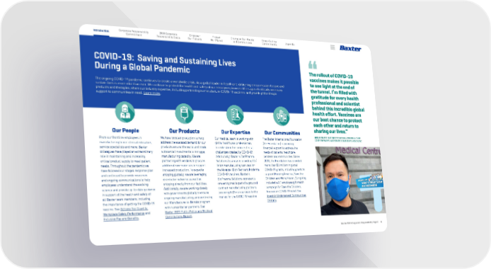 Introduction Baxter 2021 Corporate Responsibility Report 6 2030 Corporate Responsibility Goals Corporate Responsibility Commitment Empower Our Patients Protect Our Planet Appendix Champion Our People and Communities Cross-Cutting Commitments COVID-19: Saving and Sustaining Lives During a Global Pandemic The ongoing COVID-19 pandemic continues to create a worldwide crisis. As a global leader in healthcare, delivering on our mission to save and sustain lives is more vital than ever. We continue to protect the health and safety of our employees; increase the supply of critically necessary products and therapies; share our industry expertise, including partnering to manufacture COVID-19 vaccines; and provide philanthropic support to communities in need. Learn more. The rollout of COVID-19 vaccines makes it possible to see light at the end of the tunnel. I’m filled with gratitude for every health professional and scientist behind this incredible global health effort. Vaccines are our best chance to protect each other and return to sharing our lives.” NEO, BUSINESS UNIT DIRECTOR FOR BAXTER RENAL CARE, ACUTE THERAPIES AND STRATEGIC INITIATIVES, HONG KONG Our People From our frontline employees in manufacturing to our clinical educators, service specialists and more, Baxter colleagues have played an extraordinary role in maintaining and increasing critical product supply to meet patient needs. Throughout the pandemic we have followed our staged response plan and continued to provide resources and ongoing communications to help employees understand the evolving science and provide up-to-date guidance in support of the health and safety of all Baxter team members, including the importance of getting the COVID-19 vaccine. See Achieve Top Quartile Workplace Safety Performance and Inclusive Pay and Benefits. Our Communities The Baxter International Foundation (the Foundation) is providing financial support to address the needs of patients, healthcare workers and communities. Since 2020, the Foundation has provided more than $3 million in global COVID-19 grants, including grants to support Feeding America, Save the Children and World Vision. Our giving included a 2:1 employee gift match campaign for Save the Children, focused on COVID-19 relief. See Invest in Underserved Communities Globally . Our Products We have boosted production to help address the elevated demand for our products around the world and made substantial investments to increase manufacturing capacity. We are partnering with vendors to procure additional raw materials to support increased production. To expedite shipping globally, we are leveraging distributor networks as well as shipping directly from our facilities. Additionally, we are working closely with governments globally to ensure ongoing manufacturing, and continuing our Manufacture-to-Donate program with humanitarian partners. See Baxter 2021 Public Policy and Political Contributions Report. Our Expertise Our medical team is working with global healthcare professionals to understand the unique clinical challenges created by COVID-19. Additionally, Baxter’s BioPharma Solutions business is providing fill/ finish manufacturing services for the Novavax, BioNTech and Moderna COVID-19 vaccines. Baxter’s BioPharma Solutions represents one entity that is part of a group of contract manufacturing partners providing fill/finish services to the market for the COVID-19 vaccine.