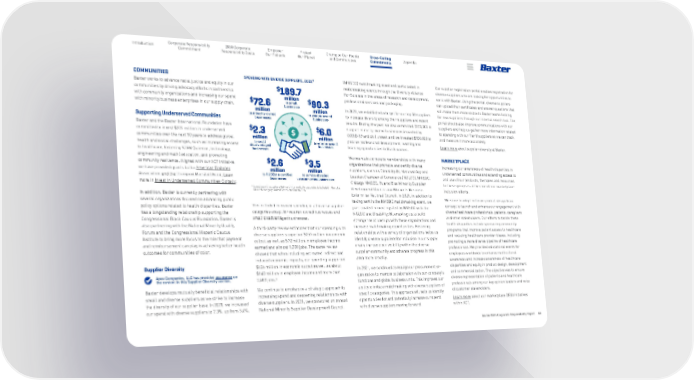 Baxter 2021 Corporate Responsibility Report 50 Cross-Cutting Commitments Corporate Responsibility Commitment Introduction 2030 Corporate Responsibility Goals Empower Our Patients Protect Our Planet Champion Our People and Communities Appendix COMMUNITIES Baxter works to advance racial justice and equity in our communities by driving advocacy efforts in partnership with community organizations and increasing our spend with minority business enterprises in our supply chain. Supporting Underserved Communities Baxter and the Baxter International Foundation have committed to invest $275 million in underserved communities over the next 10 years to address global health and social challenges, such as increasing access to healthcare, fostering STEM (science, technology, engineering and math) education, and promoting community resilience. Aligned with our ACT initiative, we have provided grants to the American Diabetes Association and the Thurgood Marshall Fund . Learn more in Invest in Underserved Communities Globally . In addition, Baxter is currently partnering with several organizations focused on advancing public policy options related to health disparities. Baxter has a longstanding relationship supporting the Congressional Black Caucus Foundation. Baxter is also partnering with the National Minority Quality Forum and the Congressional Hispanic Caucus Institute to bring more focus to the role that payment and reimbursement can play in achieving better health outcomes for communities of color. Supplier Diversity Baxter develops mutually beneficial relationships with small and diverse suppliers as we strive to increase the diversity of our supplier base. In 2021, we increased our spend with diverse suppliers to 7.3%, up from 5.6%. This included increased spending in all diverse supplier categories except for veteran-owned businesses and small disadvantaged businesses. A third-party review estimates that our spending with diverse suppliers supported $257 million in economic output as well as $72 million in employee income earned and almost 1,200 jobs. The same review showed that when including estimated indirect and induced economic impacts, our spending supported $436 million in economic output as well as about $140 million in employee income and more than 2,400 jobs. 4 We continue to emphasize a strategic approach to increasing spend and deepening relationships with diverse suppliers. In 2021, we sponsored an annual National Minority Supplier Development Council $ 1 89 . 7 million to small businesses $ 72.6 million to minority-owned businesses $ 6.0 million to veteran-owned businesses $ 2 . 6 million to HUBZone-certified businesses $ 3.5 million to service-disabled veteran–owned businesses $ 90.3 million to women-owned businesses $ 2.3 million to small disadvantaged businesses $ SPENDING WITH DIVERSE SUPPLIERS, 2021 * * Spending with suppliers that certify for multiple categories is included in the total for each category. United States and Puerto Rico. (NMSDC) matchmaking event and participated in matchmaking events through the Diversity Alliance For Science in the areas of research and development, professional services and packaging. In 2021, we established a target for our top 50 suppliers to increase diversity among their suppliers and report results. During the year, we also committed $150,000 to support minority-owned businesses impacted by COVID-19 and civil unrest, and we invested $100,000 to provide professional development, learning and training opportunities to Black women. We maintain corporate memberships with many organizations that promote and certify diverse suppliers, such as Disability:IN, National Gay and Lesbian Chamber of Commerce (NGLCC), NMSDC, Chicago NMSDC, Puerto Rico Minority Supplier Development Council and Women’s Business Enterprise National Council. In 2021, in addition to taking part in the NMSDC matchmaking event, we participated in meetings led by NMSDC with the NGLCC and Disability:IN, enabling us to build stronger relationships with these organizations and increase matchmaking opportunities. Fostering relationships with a variety of organizations helps us identify diverse suppliers for inclusion in our supply chain, increase our visibility within the diverse supplier community and advance progress in this area more broadly. In 2021, we continued to realign our procurement or - ganization to improve collaboration with our company’s functions and global business units. This improves our ability to initiate matchmaking with diverse suppliers of specific categories. This approach will help us identify opportunities for and potentially increase our spend with diverse suppliers moving forward. Our supplier registration portal enables registration for diverse suppliers who are looking for opportunities to work with Baxter. Using the portal, diverse suppliers can upload their certificates and answer questions that will make them more visible to Baxter teams looking for new suppliers through our internal search tool. The portal should also improve communications with our suppliers and help us gather more information related to spending with our Tier II suppliers so we can track and measure it more accurately. Learn more about supplier diversity at Baxter. MARKETPLACE Increasing our awareness of health disparities in underserved communities and extending access to and use of our products, therapies and resources to these groups is at the core of our marketplace inclusion efforts. We strive to adopt inclusive product design from concept to launch and enhance our engagement with diverse healthcare professionals, patients, caregivers and other stakeholders. Our efforts to tackle these health disparities include sponsoring community programs that improve patient access to healthcare and reducing healthcare provider biases, including promoting a more diverse pipeline of healthcare professionals. We provided educational events for employees worldwide to enhance mul