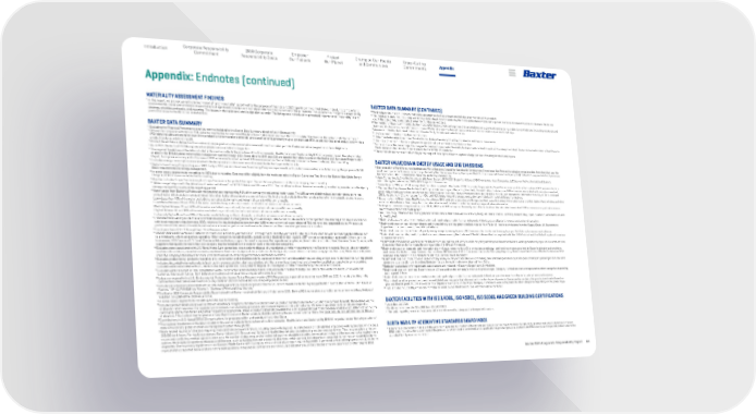 Baxter 2021 Corporate Responsibility Report 64 Appendix 2030 Corporate Responsibility Goals Corporate Responsibility Commitment Empower Our Patients Protect Our Planet Champion Our People and Communities Introduction Cross-Cutting Commitments MATERIALITY ASSESSMENT FINDINGS 1 In this report, we are not using the terms “material” and “materiality” as defined for the purposes of financial and SEC reporting in the United States. Instead, the terms refer to environmental, social and economic issues that are of significant importance to our stakeholders and to the company. These “material” issues inform our corporate responsibility strategy, priorities and goals, and reporting. The issues in this table are listed in alphabetical order. The listing does not reflect the presumed importance or “materiality” of any particular issue to Baxter or our stakeholders. BAXTER DATA SUMMARY 1 Excluding the Financial Performance section, metrics included in this Baxter Data Summary do not reflect Hillrom activity. 2 Differences compared with data on FDA websites may be due to timeframe (the date Baxter takes an action may differ from the date FDA classifies that action), definition of “recall” (FDA data includes actions taken even if the product is not removed or corrected), and classification by product group vs. product code (FDA counts each impacted product code within a product family as a distinct recall). 3 Product Recall Rate is defined as the number of unique product codes corrected or removed from the market per total Baxter owned unique product codes sold globally. 4 As of 2021, Baxter had 55 FDA-registered establishments available for inspection. 5 The regional breakdown of the data included in this section reflects the structure of the Environmental, Health, Safety and Sustainability (EHS&S) organization and the categorization of data in the EHS&S global information management system through 2021. Some data for 2019 and 2020 are updated from data reported in the Baxter 2020 Corporate Responsibility Report, to improve accuracy and in the case of GHG emissions to reflect updated GHG emission factors. Some totals vary from sum of items in category, due to rounding. 6 Excludes energy consumption associated with Baxter-operated mobile sources and renewable electricity generated on site. 7 Baxter’s Lean Energy Program began in 2007. Early in 2016, we introduced new Lean Energy Program requirements and updated some existing ones to better align the program with ISO 50001 requirements for energy management. 8 In some cases, segments do not add up to 100% due to rounding. Data may differ slightly from the totals stated in the Baxter Operations Total line of the Baxter Value Chain Energy Usage and GHG Emissions table due to rounding. 9 Number includes Scope 3 emissions plus Scope 1 emissions for product transport. Some totals vary from sum of items in category, due to rounding. 10 “ Water usage ” aligns with the definition of “ water withdrawal ” in GRI 303: Water and Effluents 2018: “ Sum of all water drawn from surface water, groundwater, seawater, or a third party for any use over the course of the reporting period. ” 11 Water usage from Baxter’s 49 sites with the greatest use, representing 96% of the company’s total annual water usage. The WRI water tool defines baseline water stress as the total annual water withdrawals (municipal, industrial and agricultural) expressed as a percentage of the total annual available flow. Higher values indicate more competition among users. Low—Less than 10% of the water available to agricultural, domestic and industrial users is withdrawn annually. Low-Med—Between 10 and 20% of the water available to agricultural, domestic and industrial users is withdrawn annually. Med-High—Between 20 and 40% of the water available to agricultural, domestic and industrial users is withdrawn annually. High—Between 40 and 80% of the water available to agricultural, domestic and industrial users is withdrawn annually. Extremely High—More than 80% of the water available to agricultural, domestic, and industrial users is withdrawn annually. 12 Estimated total water pollutant levels for treated wastewater discharged directly into waterways. Data do not include one facility that operates zero-discharge systems in accordance with local regulatory requirements. BOD 5 refers to five-day biological oxygen demand; COD refers to chemical oxygen demand; TSS refers to total suspended solids. When actual performance data were not available, estimates are based on performance at similar facilities or on other measured performance indicators. 13 Fiscal year basis (Oct. 1 through Sept. 30 of the year noted). 14 United States and Puerto Rico. Data for 2019 and 2020 are fiscal year basis (Oct. 1 through Sept. 30 of the year noted). Data for 2021 are calendar year. Accounts payable data are sent to a third party, which categorizes spending. Other categories include disability-owned, service-disabled veteran–owned, LGBT-owned, small disadvantaged and HUBZone-certified businesses. HUBZone is a U.S. Small Business Administration program for small companies that operate and employ people in Historically Underutilized Business Zones. Spending with suppliers that qualify for more than one category may be included in the totals for each of the relevant categories. 15 Excludes waste associated with U.S. Renal Home Care operations, since patients dispose of unused product rather than returning it to Baxter for disposal. Also excludes construction and demolition debris, remediation waste, wastewater treatment sludge and discarded manufacturing and process-related machinery or equipment. Removing these waste categories from the company total allows for more consistent evaluation of facility performance and trends over time. 16 Excludes production by-products reused on-site, construction and demolition debris, wastewater treatment and discarded manufacturing and pro