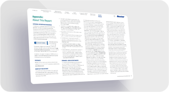 Baxter 2021 Corporate Responsibility Report 52 Appendix 2030 Corporate Responsibility Goals Corporate Responsibility Commitment Empower Our Patients Protect Our Planet Champion Our People and Communities Introduction Cross-Cutting Commitments Appendix: About This Report EXTERNAL REPORTING STANDARDS To develop our corporate responsibility reporting approach, we have considered the disclosure frameworks and guidance of leading sustainability standards and reporting organizations, including the Global Reporting Initiative (GRI), the Sustainability Accounting Standards Board (SASB), the United Nations Sustainable Development Goals and third- party raters and rankers focused on environmental, social and governance issues. We were one of the first companies to pilot the GRI Sustainability Reporting Guidelines, in 1999, and belong to the GRI Community. We referenced the GRI Sustainability Reporting Standards in the development of this report. See the GRI Content Index for detail. In addition, this report includes our SASB disclosure , based on the SASB Medical Equipment and Supplies Sustainability Accounting Standard. FEEDBACK Readers of this report can provide comments and suggestions to us via email: corporate responsibility [email protected] . SCOPE OF THIS REPORT The performance and other data in this report are from calendar year 2021 unless stated otherwise. Some examples and program descriptions include information from 2022. • This report covers Baxter’s global operations, including subsidiaries, unless stated otherwise. Environmental, health, safety and sustainability data include joint ventures where we have a controlling interest. • The content in this report refers to Baxter and does not include Hillrom, unless stated otherwise. Our 2022 Corporate Responsibility Report will reflect the combined company. • All currency in this report is in U.S. dollars unless stated otherwise. • Significant restatements of data compared with prior years are noted in the sections where they appear. • All references to “new product launches” in this report include new product launches, line extensions and geographical expansions, unless otherwise noted. • This report is intended for global use. Please consult the appropriate country-specific Baxter website for information regarding activities in that country. • Some statements in this report about products or procedures may differ from the licensed indi- cations in specific countries. Therefore, always consult the country-specific summary of product characteristics, package leaflets or instructions for use. For more information, please contact a local Baxter representative. FORWARD-LOOKING STATEMENTS This report contains forward-looking statements concerning Baxter, including with respect to compliance, future performance, our 2030 Corporate Responsibility Commitment and other plans and initiatives. These statements are based on assumptions about many important factors, including the following, which could cause actual results to differ materially from those in the forward-looking statements: the impact of global economic conditions (including potential trade wars and economic sanctions) and public health crises and epidemics, such as the ongoing coronavirus (COVID-19) pandemic, on us and our employees, customers and suppliers, including foreign governments in countries in which we operate; demand for and market acceptance of risks for new and existing products; product development risks (including any delays in obtaining required regulatory approvals or failures to obtain such approvals); product quality or patient safety concerns; continuity, availability and pricing of acceptable raw materials and component supply; inability to create additional production capacity in a timely manner or the occurrence of other manufacturing or supply difficulties (including as a result of natural disasters, public health crises and epidemics/pandemics, geopolitical crises, regulatory actions or otherwise; accurate identification of and execution on business development and R&D opportunities and realization of anticipated benefits (including the acquisitions of Cheetah Medical, Seprafilm Adhesion Barrier, specified OUS rights to Caelyx / Doxil formulations, full U.S. and specific OUS rights to Transderm Scop scopolamine patch, PerClot hemostat, Hillrom and certain rights to Zosyn in the U.S. and Canada); breaches or failures of our information technology systems or products, including by cyberattack, unauthorized access or theft; the adequacy of our cash flows from operations (which may be negatively impacted by collectability concerns as a result of the ongoing COVID-19 pandemic or otherwise) and other sources of liquidity to meet our ongoing cash obligations and fund our investment program; loss of key employees or inability to identify and recruit new employees; future actions of regulatory bodies and other governmental authorities, including FDA, the Department of Justice, the SEC, the New York Attorney General and foreign regulatory agencies, including the continued delay in lifting the warning letter at our Ahmedabad facility; the outcome of pending or future litigation, including the opioid litigation and current and future ethylene oxide litigation or other claims; proposed regulatory changes of the U.S. Department of Health and Human Services in kidney health policy and reimbursement, which may substantially change the U.S. end-stage renal disease market and demand for our peritoneal dialysis products, necessitating significant multiyear capital expenditures, which are difficult to estimate in advance; failures with respect to compliance programs; future actions of third parties, including payers; U.S. healthcare reform and other global austerity measures; pricing, reimbursement, taxation and rebate policies of government agencies and private payers; the impact of competitive products and pricing, including generic competition, drug reimp