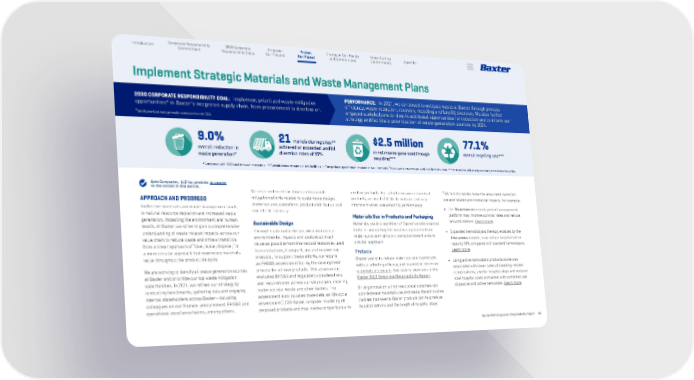Baxter 2021 Corporate Responsibility Report 30 Protect Our Planet Corporate Responsibility Commitment Introduction 2030 Corporate Responsibility Goals Empower Our Patients Appendix Champion Our People and Communities Cross-Cutting Commitments Implement Strategic Materials and Waste Management Plans 2030 CORPORATE RESPONSIBILITY GOAL : Implement prioritized waste mitigation opportunities* in Baxter’s integrated supply chain, from procurement to distribution. * Identify prioritized waste generation sources by the end of 2024. PERFORMANCE: In 2021, we continued to mitigate waste at Baxter through process efficiency, waste reduction, recovery, recycling and landfill diversion. We also further engaged stakeholders to identify additional opportunities for reduction and to inform our strategy and facilitate prioritization of waste generation sources by 2024. 77.1% overall recycling rate*** 9.0% overall reduction in waste generation* *Compared with 2020 and indexed to revenue. **Certain waste streams at two facilities in Europe have government-mandated requirements. These waste streams are excluded from the total. ***Incineration with energy recovery is considered recycling. APPROACH AND PROGRESS Ineffective materials and waste management leads to natural resource depletion and increased waste generation, impacting the environment and human health. At Baxter, we strive to gain a comprehensive understanding of waste-related impacts across our value chain to reduce waste and drive a transition from a linear approach of “take, make, dispose,” to a more circular approach that maximizes materials value throughout the product life cycle. We are working to identify all waste generation sources at Baxter and prioritize our top waste mitigation opportunities. In 2021, we refined our strategy by conducting benchmarks, gathering data and engaging internal stakeholders across Baxter—including colleagues on our finance, procurement, EHS&S and operational excellence teams, among others. We also continued our longstanding waste mitigation efforts related to sustainable design, materials use, operations, product distribution and end-of-life recovery. Sustainable Design Through sustainable design, we minimize our environmental impacts and capture as much value as possible from the natural resources used to manufacture, transport, use and recover our products. To support these efforts, we require an EHS&S assessment during the development process for all new products. This assessment evaluates EHS&S and regulatory considerations and requirements across our value chain, covering materials use, waste and other factors. The assessment also includes more detailed life cycle assessment (LCA)–based computer modeling of proposed products and may involve comparison with existing products. For select new and established products, we use full LCAs to evaluate and help improve product sustainability performance. Materials Use in Products and Packaging Materials use is a key driver of Baxter’s environmental footprint and getting the most value possible from materials is central to our transition toward a more circular approach. Products Baxter works to reduce materials use in products without affecting efficacy, and to avoid or minimize materials of concern. See several examples in the Baxter 2020 Corporate Responsibility Report. Driving innovation to improve clinical outcomes can also decrease materials use and waste. Recent studies indicate that several Baxter products can help reduce hospitalizations and the length of hospital stays. This in turn can decrease the associated materials use and related environmental impacts. For example: • Our Sharesource remote patient management platform may improve survival rates and reduce hospitalizations. Learn more. • Expanded hemodialysis therapy, enabled by the Theranova dialyzer, may reduce hospitalization rates by 18% compared with standard hemodialysis. Learn more. • Using active hemostatic products alone was associated with lower rates of bleeding-related complications, shorter hospital stays and reduced total hospital costs compared with combined use of passive and active hemostats. Learn more. Apex Companies, LLC has provided assurance on the content in this section. 21 manufacturing sites** achieved or exceeded landfill diversion rates of 95% $2.5 million in net income generated through recycling*** Protect Our Planet Corporate Responsibility Commitment Introduction 2030 Corporate Responsibility Goals Empower Our Patients Appendix Champion Our People and Communities Cross-Cutting Commitments