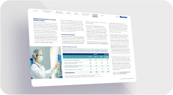 Baxter 2021 Corporate Responsibility Report 49 Cross-Cutting Commitments Corporate Responsibility Commitment Introduction 2030 Corporate Responsibility Goals Empower Our Patients Protect Our Planet Champion Our People and Communities Appendix Building Cultural Competence to Advance Workplace Inclusion Baxter provides employees with training, tools and resources to build cultural awareness and compe - tence to engage more authentically with each other. Resources include leadership toolkits for managing global, diverse teams; holding inclusive meetings; personalized cultural assessments; exploring dimensions of diversity as a team; and mitigating day-to-day biases across many of our human resources processes. Many employees also work on global teams, enabling them to build cultural competence through daily interactions, and we encourage employees to practice simple acts of inclusion in their day-to-day routines. We work to embed awareness of unconscious bias throughout our company and require all employees to take a self-guided e-learning module about uncon - scious bias. In addition, we have integrated prompts in key human resources processes, such as hiring activities, talent assessment, succession planning and feedback, to help employees think about their biases as they undertake these activities. Inclusive Pay and Benefits One of the ways we work to achieve equity at Baxter is by implementing a total compensation philosophy that provides market-competitive pay and benefits globally while rewarding employees for strong individual and business performance. Baxter is also committed to periodically assessing our efforts through robust pay audits and reviews. A fter controlling for legitimate factors such as type of role, prior work experience, tenure in the organization, tenure in role and geographic location, a review of our 2021 pay equity study of U.S. salaried workforce revealed no significant pay differences among men, women and ethnic minorities. In addition, approximately 35% of our employees work in positions (largely in our plant locations) where salary levels are based solely on the job or the job and tenure, eliminating the possibility of pay equity discrepancies. Baxter provides competitive and inclusive employee programs and benefits that support career advancement, workplace f lexibility and employee wellness. To support working parents and caregivers, we also offer parental leave, adoption and fertility benefits, mento- ring for new parents, lactation services and benefits, backup childcare and subsidized care, educational support for working parents, caregiver services and an employee assistance program. Throughout the global pandemic, we have worked to help employees cope with the impacts of COVID-19. For example, Baxter provides resources to help employees prioritize wellness and work-life balance as well as tips for using Baxter’s technology to stay connected and productive. Our WorkSmart Virtually resources help employees cultivate habits to work remotely with ease, connect with co-workers, build team effectiveness and lead through crisis with empathy and emotional intelligence. We also rolled out a meditation app globally to help our employees prioritize mental health and well-being during this stressful time and introduced monthly wellness days and nutritional coaching for U.S.-based employees. For many years, Baxter has recognized the increasing demands on employees to manage their personal and work lives, and we respect the need for different approaches to where, how and when work gets done. We provide employees and managers with tools and resources to navigate ad hoc or ongoing flexible arrangements and encourage employees to speak with managers about what options might be right for them and their jobs. Learn more about workplace flexibility at Baxter. Learn more about employee compensation and benefits and executive compensation. Diverse perspectives are valued at Baxter 60% 63% 75% 72% My direct manager does a good job of managing people from diverse backgrounds 70% 72% 80% 78% I am comfortable voicing my ideas and opinions, even if they are different from others 64% 68% 76% 75% My direct manager cares about me as a person 71% 74% 78% 78% Overall Inclusion Score 66% 69% 77% 75% BAXTER ** GLOBAL 2018 2019 2021 2021 average *** Baxter conducts Best Place to Work surveys, through which our employees rate Baxter’s workplace across various categories, including for factors related to inclusion. Our overall inclusion score for 2021 increased 8 percentage points compared with the last time we conducted the survey, in 2019, and 11 percentage points compared with 2018. Individual metrics within the inclusion category also showed improvement. (See Baxter Data Summary for Best Place to Work survey results in additional categories.) MEASURING WORKPLACE INCLUSION * * Scores indicate the percentage of survey participants who responded favorably to statements related to each of the categories listed. ** Baxter did not administer a Best Place to Work survey in 2020 due to impacts related to the COVID-19 pandemic. *** Data are from Qualtrics Benchmark Database and represent more than 750 companies (including Baxter) and more than 20 million responses.