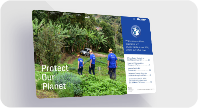 Baxter 2021 Corporate Responsibility Report 19 Protect Our Planet Corporate Responsibility Commitment Introduction 2030 Corporate Responsibility Goals Empower Our Patients Appendix Champion Our People and Communities Cross-Cutting Commitments Achieve Carbon Neutrality for Direct Operations by 2040 .........20 Implement Strategic Water Management Plans...............25 Advance Sustainable Procurement ....................28 Implement Strategic Materials and Waste Management Plans .....30 Environmental, Health, Safety and Sustainability Governance and Additional Disclosures ........33 Protect Our Planet Prioritize operational excellence and environmental stewardship across our value chain Photo: Several employees in Colombia participate in forest protection and conservation volunteering. Protect Our Planet Corporate Responsibility Commitment Introduction 2030 Corporate Responsibility Goals Empower Our Patients Cross-Cutting Commitments Appendix Champion Our People and Communities