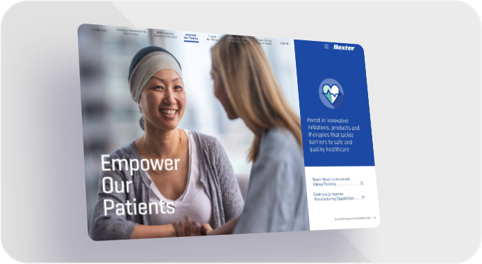 Baxter 2021 Corporate Responsibility Report 14 Empower Our Patients Protect Our Planet Appendix Champion Our People and Communities Corporate Responsibility Commitment Introduction 2030 Corporate Responsibility Goals Cross-Cutting Commitments Reach More Underserved Kidney Patients ...............15 Continually Improve Manufacturing Capabilities.....17 Empower Our Patients Invest in innovative initiatives, products and therapies that tackle barriers to safe and quality healthcare Empower Our Patients Protect Our Planet Appendix Champion Our People and Communities Corporate Responsibility Commitment Introduction 2030 Corporate Responsibility Goals Cross-Cutting Commitments
