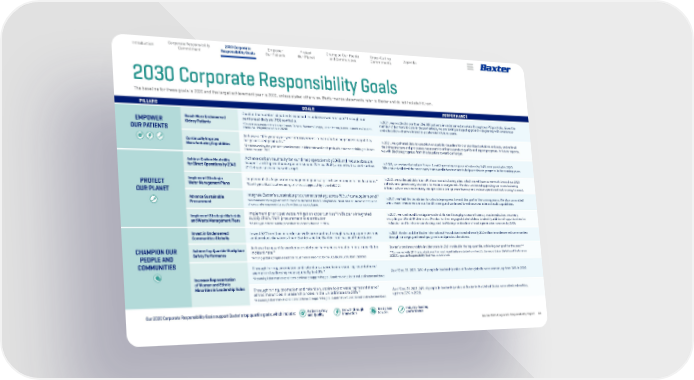 Baxter 2021 Corporate Responsibility Report 13 2030 Corporate Responsibility Goals Empower Our Patients Protect Our Planet Appendix Champion Our People and Communities Corporate Responsibility Commitment Introduction Cross-Cutting Commitments Our 2030 Corporate Responsibility Goals support Baxter's top quartile goals, which include: Patient safety and Quality Best place to work Growth through innovation Industry-leading performance PILLARS GOALS PERFORMANCE EMPOWER OUR PATIENTS Reach More Underserved Kidney Patients Double the number of patients reached in underserved markets* through our peritoneal dialysis (PD) portfolio. * Countries outside of the United States, Canada, Western Europe, Japan, Korea, Australia and New Zealand. (Baseline: 198,000 patients in 2020) In 2021, we reached more than 204,000 patients in underserved markets through our PD portfolio. Given the number of barriers to care in these markets, we are taking a staged approach—beginning with awareness and education—that we intend to accelerate in future years. Continually Improve Manufacturing Capabilities Achieve a 10% year-over-year improvement in manufacturing process capability for prioritized products.* * As measured by the year-over-year decrease in defect rate until each product’s process capability goal is met. (Baseline year: 2021) In 2021, we gathered data to establish a capability baseline for our sterilized solutions and sets, and refined the infrastructure and processes necessary to enhance product quality and report progress. In future reports, we will disclose progress from this baseline toward our target. PROTECT OUR PLANET Achieve Carbon Neutrality for Direct Operations by 2040 Achieve carbon neutrality for our direct operations by 2040 and reduce absolute Scope 1 and 2 greenhouse gas emissions 25% by 2030, aligned with a well-below 2⁰ Celsius science-based target. In 2021, we reduced absolute Scope 1 and 2 greenhouse gas emissions by 0.4% compared with 2020. We also established the necessary teams and infrastructure to help accelerate progress in the coming years. Implement Strategic Water Management Plans Implement strategic water management plans at prioritized manufacturing locations. * * Identify prioritized locations using a risk-based approach by the end of 2023. In 2021, we collected data from all of our manufacturing sites, which we will use as we work toward our 2023 milestone of prioritizing locations for water management. We also continued upgrading our manufacturing infrastructure and modernizing our operations to improve efficiency and reduce operational risk moving forward. Advance Sustainable Procurement Integrate Baxter’s sustainable procurement strategy across 90% of our supplier spend. * * As measured by supplier commitment to Baxter’s Ethics & Compliance Standards and Baxter’s completion of corporate responsibility audits within our supply base. In 2021, we laid the foundation to calculate progress toward this goal in the coming years. We also committed to increase investments in staff and training and continued to enhance our internal audit capabilities. Implement Strategic Materials and Waste Management Plans Implement prioritized waste mitigation opportunities* in Baxter’s integrated supply chain, from procurement to distribution. * Identify prioritized waste generation sources by the end of 2024. In 2021, we continued to mitigate waste at Baxter through process efficiency, waste reduction, recovery, recycling and landfill diversion. We also further engaged stakeholders to identify additional opportunities for reduction and to inform our strategy and facilitate prioritization of waste generation sources by 2024. CHAMPION OUR PEOPLE AND COMMUNITIES Invest in Underserved Communities Globally Invest $275 million in underserved communities through strategic partnerships and product donations from Baxter and the Baxter International Foundation. In 2021, Baxter and the Baxter International Foundation invested nearly $52 million in underserved communities through strategic partnerships, grants and product donations. Achieve Top Quartile Workplace Safety Performance Achieve top quartile workplace safety performance annually in total recordable incident rate.* * Among global companies across industries as reported by the U.S. Bureau of Labor Statistics. Baxter’s total recordable incident rate in 2021 ranked in the top quartile, achieving our goal for the year.** **Compared with 2019 data, which was the most recent data available from the U.S. Bureau of Labor Statistics at the time our 2030 Corporate Responsibility Goal was established. Increase Representation of Women and Ethnic Minorities in Leadership Roles Through hiring, promotion and retention, aspire to increase representation of women in leadership roles globally to 40%.* * Assuming labor market conditions continue to support the goal. Leadership role is defined as director and above. As of Dec. 31, 2021, 36% of people in leadership roles at Baxter globally were women, up from 34% in 2020. Through hiring, promotion and retention, aspire to increase representation of ethnic minorities in leadership roles in the United States to 25%.* * Assuming labor market conditions continue to support the goal. Leadership role is defined as director and above. As of Dec. 31, 2021, 24% of people in leadership roles at Baxter in the United States were ethnic minorities, up from 22% in 2020. 2030 Corporate Responsibility Goals The baseline for these goals is 2020 and the target achievement year is 2030, unless stated otherwise. Performance statements refer to Baxter and do not include Hillrom.
