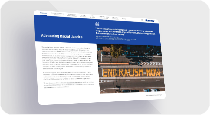Introduction Baxter 2021 Corporate Responsibility Report 7 2030 Corporate Responsibility Goals Corporate Responsibility Commitment Empower Our Patients Protect Our Planet Appendix Champion Our People and Communities Cross-Cutting Commitments Advancing Racial Justice We are united by our mission to save and sustain lives, which rests on a strong foundation and commitment to diversity, equity and inclusion (DE&I) globally. Racism, intolerance, marginalization and discrimination affect our colleagues, families, friends and communities worldwide in countless forms. In 2020, we launched ACT: Activating Change Today, a global, multidimensional and multiyear initiative to advance racial justice. While this initiative was prompted by the murder of George Floyd in the United States, ACT is intended to address other racial/ethnic minority injustices around the world as well. In the United States, the focus of our ACT effort is on the Black community. Outside of the United States, our regional and country teams are working to address injustices that affect various races and ethnicities , throughout the EMEA and APAC regions. We expect to continue expanding our efforts in other countries in 2022 and beyond. As the name suggests, ACT is about taking action to drive results. We want to achieve meaningful, sustainable change and be part of the solution to the complex, longstanding, multifaceted societal issue of racial injustice. We are acting with a sense of urgency, prioritizing initiatives around the world that we believe will make the biggest impact. We have aligned our ACT initiatives to our four DE&I strategic pillars—workforce, workplace, communities and marketplace—to ensure we approach this issue in a comprehensive manner. Learn more about our most recent ACT:ions. This is a generational defining moment. I know that the conversations are tough... conversations of race, of social injustice, of systemic oppression. But we should have them anyway.” NOSA, TERRITORY BUSINESS MANAGER, ADVANCED SURGERY Employees heard from their colleague, Nosa, on his views and experiences with institutional and systemic racism in the United States. As part of our ACT initiative, Baxter is working to foster open, honest conversations. To hear from Nosa, click here.