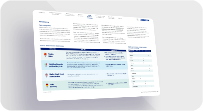 Baxter 2021 Corporate Responsibility Report 26 Protect Our Planet Corporate Responsibility Commitment Introduction 2030 Corporate Responsibility Goals Empower Our Patients Appendix Champion Our People and Communities Cross-Cutting Commitments Manufacturing Water management Baxter’s EHS&S Policy outlines our commitment to drive programs to help achieve Baxter’s environmental goals and reduce our environmental impacts, including those related to water use and wastewater discharges . Learn more about EHS&S governance at Baxter. We work to better understand the impacts of water use across our business and implement conservation and efficiency projects at our manufacturing facilities. In 2021, we used approximately 14.7 million cubic meters of water, 1 a 0.6% increase compared with 2020 and a 6.6% decrease indexed to revenue. Water is an important raw material for our business, and we recognize that water-related risks have the potential to negatively impact our operations and the communities where we operate. Water issues vary significantly by location, and we keep a close eye on water stress across our sites, understanding it is a physical risk that could negatively impact our business continuity. We use the World Resources Institute Aqueduct Water Risk Atlas version 3.0 to map and analyze current and future risks associated with water stress at our most significant water-use locations. 2 Our 49 most significant water-use locations represented 96% of our total water use in 2021. Of the 49 sites, 23 are located in medium-high, high and extremely high water-stress areas as indicated in the chart below. Of these facilities, 10 use less than 100,000 cubic meters of water per year, reducing the facilities’ exposure to water risk and related impacts across associated watersheds. During the year, water use at these 23 sites decreased by 0.5% in absolute terms and by 7.7% indexed to revenue compared with 2020. SELECTED WATER EFFICIENCY PROJECTS, 2021 BAXTER MANUFACTURING SITES IN LOCATIONS WITH WATER STRESS RISK LOCATION PROJECT BENEFITS * Tianjin, China We implemented a project to recover condensed steam from our boiler, which was then reused to decrease overall water use at the site. This reduction is critical to maintain business continuity since this facility operates in a water-stress area and is therefore at potential risk for restrictions on water use. ✓ Reduced total site water use by 22% per unit of production ✓ Reduced boiler use of soft water by 50% (boiler water use accounted for 30% of all water usage for this site in 2021) Valtellina (Grosotto and Sondalo), Italy We implemented several activities to reduce water use, including optimization of HVAC systems and cleaning and sanitization processes, changes in sterilization cooling, and installation of a new glass bottle washing machine. ✓ Reduced water use by more than 150,000 cubic meters Marion (North Cove), North Carolina We executed a series of projects to reduce water use in our production processes. ✓ Reduced water use by more than 100,000 cubic meters Halle, Germany We installed decentralized, efficient chillers to help ensure a reliable cold-water supply for our manufacturing process. Integrating warehouse ceiling cooling units and compressed air generation into the cooling network resulted in well-water savings. ✓ Reduced water use by more than 60,000 cubic meters SITE LOCATION MEDIUM-HIGH HIGH EXTREMELY HIGH Australia 1 Belgium 1 Brazil 1 China 1 2 Germany 1 3 India 1 Malta 1 Mexico 3 Saudi Arabia 1 Spain 1 Thailand 1 Tunisia 1 UK 1 United States 1 1 1 * Compared with 2020.