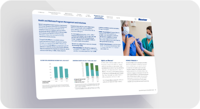 Baxter 2021 Corporate Responsibility Report 40 Champion Our People and Communities Corporate Responsibility Commitment Introduction 2030 Corporate Responsibility Goals Empower Our Patients Protect Our Planet Appendix Cross-Cutting Commitments Injuries and Illnesses 3 In 2021, Baxter’s total recordable incident rate fell by 20% compared with 2020. Our ongoing work to drive continuous improvement, raise awareness about common injuries sustained by employees and engage operational leaders in efforts to reduce injury and illness are helping to improve our workplace safety performance. Four major incidents 4 occurred at Baxter in 2021, compared with 12 the prior year. See the Baxter Data Summary for workplace safety data by region and major incidents. Baxter’s occupational health function, in partnership with Human Resources and Global Communications, develops health and wellness strategies for the company to help our employees take care of their personal well-being. A global team of diverse health professionals and volunteers, known as Local Champions, helps refine and implement these approaches and set priorities. Through BeWell@Baxter, our global employee health and wellness program, we promote healthy lifestyles. In response to the COVID-19 pandemic, we transitioned BeWell@Baxter campaigns to virtual sessions or activities and launched Monthly Wellness Days to emphasize the importance of physical, mental and social well-being. In 2021, these programs MOVING FORWARD >> As we look ahead, we will continue to prioritize a zero-harm workplace in an effort to drive down injuries. In future years, we expect to enhance our approach with digital solutions and data analytics to develop risk profiles and identify leading indicators for prioritization. We will also continue to engage our employees with real-time coaching about safe work practices and empower them to take charge of safety in the workplace. Finally, we will drive continuing improvement through standardized global training, safety engineering for equipment and mentoring activities. focused on total well-being and included topics such as mental health, stress management, career wellness, environmental wellness and the importance of laughter. For BeWell@Baxter programs in 2021, 30% of employees participated in the Exercise Challenge and 32% had completed a Personal Wellness Profile. 2 In addition, 92% of facilities worldwide took part in Healthy Eating Month. Baxter’s occupational health team also delivered the following in 2021: • Flu vaccinations: We offered free seasonal flu vaccinations to employees working at most sites with 25 or more employees. More than 12,000 BAXTER TOTAL RECORDABLE INCIDENT RATE, 2019-2021 * ADDITIONAL WORKPLACE SAFETY DATA, 2019-2021* * Rates include COVID-19 cases. Public health guidance varies around the world concerning isolation and quarantine days for COVID-19. Probable work-related COVID-19 cases average 10 days lost per CDC guidance and account for days away from work due to the illness. employees worldwide received vaccinations through this program. • COVID-19 vaccinations: To support Baxter’s response to the global pandemic, we provided onsite vaccinations, consistent with applicable regulations, in several locations around the world where the vaccine was readily available and allowed by local government authorities. • Smoke-free workplaces: In countries where smoke-free status is allowed by law, 100% of campuses with 25 or more employees were smoke-free. Total Recordable 0.40 0.41 0.33 Incident Rate 0.0 0.1 0.2 0.3 0.4 0.5 2019 2020 2021 Cases with Days Lost Rate 0.090 0.174 0.116 Days Lost Rate 2.14 4.80 4.15 Restricted Days Rate ** 7.83 4.83 3.89 0.0 1.0 2.0 3.0 4.0 5.0 6.0 7.0 8.0 9.0 10.0 2019 2020 2021 Health and Wellness Program Management and Initiatives Rates include COVID-19 cases. Public health guidance varies around the world concerning isolation and quarantine days for COVID-19. Probable work-related COVID-19 cases average 10 days lost per CDC guidance and account for days away from work due to the illness. Restricted Days Rate data for 2020 was updated following publication of our 2020 Corporate Responsibility Report due to updates beyond that year’s reporting period. ** *