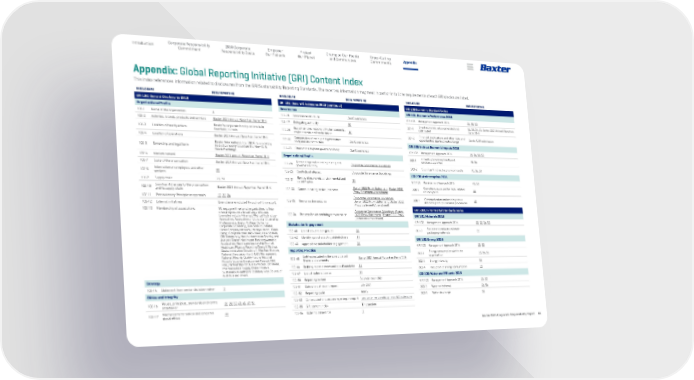 Baxter 2021 Corporate Responsibility Report 61 Appendix 2030 Corporate Responsibility Goals Corporate Responsibility Commitment Empower Our Patients Protect Our Planet Champion Our People and Communities Introduction Cross-Cutting Commitments Appendix: Global Reporting Initiative (GRI) Content Index GRI 102: General Disclosures 2016 (continued) Governance 102-18 Governance structure Our Governance 102-19 Delegating authority 10 102-20 Executive-level responsibility for economic, environmental and social topics 10 102-22 Composition of the highest governance body and its committees Our Governance 102-23 Chair of the highest governance body Our Governance Organizational Profile 102-24 Nominating and selecting the highest governance body Corporate Governance Guidelines 102-25 Conflicts of interest Corporate Governance Guidelines 102-31 Review of economic, environmental and social topics 11 102-33 Communicating critical concerns Baxter 2022 Proxy Statement, (Baxter 2022 Proxy Statement Amendment) 102-35 Remuneration policies Corporate Governance Guidelines, Baxter 2022 Proxy Statement, (Baxter 2022 Proxy Statement Amendment) 102-36 Process for determining remuneration Corporate Governance Guidelines, Baxter 2022 Proxy Statement, (Baxter 2022 Proxy Statement Amendment) Stakeholder Engagement 102-40 List of stakeholder groups 11 102-42 Identifying and selecting stakeholders 11 102-43 Approach to stakeholder engagement 11 Reporting Practice 102-45 Entities included in the consolidated financial statements Baxter 2021 Annual Report on Form 10-K 102-46 Defining report content and topic Boundaries 11 102-47 List of material topics 11 102-50 Reporting period Calendar year 2021 102-51 Date of most recent report July 2021 102-52 Reporting cycle Yearly 102-53 Contact point for questions regarding the report corporate_responsibility_report@baxter.com 102-55 GRI content index This section 102-56 External assurance 2 DISCLOSURE DISCLOSURE DISCLOSURE GRI 102: General Disclosures 2016 Organizational Profile 102-1 Name of the organization 4 102-2 Activities, brands, products and services Baxter 2021 Annual Report on Form 10-K 102-3 Location of headquarters Baxter's corporate headquarters is in Deerfield, Illinois. 102-4 Location of operations Baxter 2021 Annual Report on Form 10-K 102-5 Ownership and legal form Baxter International Inc. (BAX) is a publicly traded company listed on the New York Stock Exchange. 102-6 Markets served Baxter 2021 Annual Report on Form 10-K 102-7 Scale of the organization Baxter 2021 Annual Report on Form 10-K 102-8 Information on employees and other workers 55 102-9 Supply chain 28, 54 102-10 Significant changes to the organization and its supply chain Baxter 2021 Annual Report on Form 10-K 102-11 Precautionary Principle or approach 17, 30, 34 102-12 External initiatives Examples are included throughout this report. 102-13 Membership of associations We engage with external organizations to help drive progress on a broad range of issues. Examples include Advanced Medical Technology Association, Association of Corporate Citizenship Professionals, Boston College Center for Corporate Citizenship, Business Roundtable, Ceres Company Network, Chicago United, Clean Cargo, Congressional Black Caucus Foundation, GRI Community, Health Information Sharing and Analysis Center, Healthcare Businesswomen’s Association, Healthcare Leadership Council, Healthcare Plastics Recycling Council, Medical Device Innovation Consortium, MedTech Europe, National Association for EHS&S Management, National Minority Quality Forum, National Minority Supplier Development Council, ORC HSE, Partnership for Quality Medical Donations, Pharmaceutical Supply Chain Initiative, Sustainable Healthcare Coalition, Vinyl Council of Australia and others. Strategy 102-14 Statement from senior decision-maker 3 Ethics and Integrity 102-16 Values, principles, standards and norms of behavior 20, 28, 37, 43, 45, 47, 51 102-17 Mechanisms for advice and concerns about ethics 44 2021 REPORTING 2021 REPORTING 2021 REPORTING GRI 200 Economic Standard Series GRI 201: Economic Performance 2016 GRI 103 Management Approach 2016 36, 50, 53 201-1 Direct economic value generated and distributed 36, 50, 54, 55 , Baxter 2021 Annual Report on Form 10-K 201-2 Financial implications and other risks and opportunities due to climate change Baxter CDP submission GRI 203: Indirect Economic Impacts 2016 GRI 103 Management Approach 2016 15, 36, 50, 53 203-1 Infrastructure investments and services supported 15, 36 203-2 Significant indirect economic impacts 15, 36, 50 GRI 205: Anticorruption 2016 GRI 103 Management Approach 2016 43, 53 205-1 Operations assessed for risks related to corruption 44 205-2 Communication and training about anticorruption policies and procedures 43 GRI 300 Environmental Standards Series GRI 301: Materials 2016 GRI 103 Management Approach 2016 30, 32, 34, 53 301-3 Reclaimed products and their packaging materials 32 GRI 302: Energy 2016 GRI 103 Management Approach 2016 23, 53 302-1 Energy consumption within the organization 23, 54, 56 302-3 Energy intensity 54 302-4 Reduction of energy consumption 23 GRI 303: Water and Effluents 2018 GRI 103 Management Approach 2016 25, 53 303-3 Water withdrawal 26, 54 303-4 Water discharge 54 This index references information related to disclosures from the GRI Sustainability Reporting Standards. The reported information may meet in part or in full the requirements of each GRI disclosure listed.
