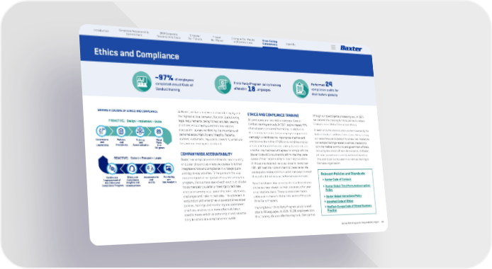 Baxter 2021 Corporate Responsibility Report 43 Cross-Cutting Commitments Corporate Responsibility Commitment Introduction 2030 Corporate Responsibility Goals Empower Our Patients Protect Our Planet Champion Our People and Communities Appendix Ethics and Compliance Third Party Program policy training offered in 18 languages ~97% of employees completed annual Code of Conduct training Performed 24 compliance audits for distributors globally At Baxter, we work to drive a culture of integrity and the highest ethical behavior. We prioritize following legal requirements, being honest and fair, keeping promises, encouraging questions and valuing discussion—always reinforcing the importance of personal accountability and integrity. Patients, doctors, customers, regulators, investors, communi- ties and our employees count on it. COMPANYWIDE ACCOUNTABILITY Baxter has compliance committees for each country or cluster of countries where we operate to further integrate ethics and compliance in strategic plans and day-to-day activities. To help ensure the local implementation of our global ethics and compliance program, the business lead of each country or cluster holds mandatory quarterly meetings to facilitate discussion among local leadership about key issues, challenges and risks in their area. This approach, in conjunction with enterprise-wide established codes, policies, trainings and monitoring and assessment practices, enables us to more effectively target specific needs and drive ownership of and responsi- bility for ethics and compliance worldwide. Continuous Improvement of the Ethics and Compliance Program Ethics and Compliance Helpline and Investigations Asssessments and Audits Monitoring and Data Analytics PROACTIVE: Design > Implement > Guide Third Party Due Diligence Training and Communication Governance and Leadership Policies and Procedures REACTIVE: Detect > Prevent > Learn Relevant Policies and Standards ` Baxter Code of Conduct ` Baxter Global Third Party Anticorruption Policy ` Baxter Global Interactions Policy ` AdvaMed Code of Ethics ` MedTech Europe Code of Ethical Business Practice ETHICS AND COMPLIANCE TRAINING All employees are required to complete Code of Conduct training annually. In 2021, approximately 97% of employees completed the training. In addition to this training, we conducted an employee engagement campaign to reinforce the importance of ethics and compliance. More than 17,000 email-enabled employ - ees received a questionnaire, asking them to indicate whether they had read and agreed to comply with the Baxter Code of Conduct and to affirm that they were aware of their responsibility to report any violations. Of those who received the questionnaire, more than 98% affirmed their commitment to these items. We developed a related communication campaign to reach those who did not receive the formal questionnaire. 1 Select employees also complete ethics and compliance online courses relevant to their jobs every other year on a rotational basis. These courses cover topics addressed in Baxter’s Global Interactions Policy and Third Party Program. Training for our Third Party Program policy is avail - able in 18 languages. In 2021, 10,300 employees took this training. We also offer training to all third parties through our due diligence processing tool. In 2021, we updated the training for third parties to reflect changes in our Global Interactions Policy. In addition to the anticorruption content covered by the Code of Conduct and Global Interactions Policy training, our sales force participates in business-led, interactive workshops/trainings related to ethical interactions with the medical community and government officials, including discussion of real-life scenarios. At Baxter, off-label promotion is strictly prohibited by policy. This prohibition is included in our annual training to the Sales organization. DRIVING A CULTURE OF ETHICS AND COMPLIANCE Cross-Cutting Commitments Corporate Responsibility Commitment Introduction 2030 Corporate Responsibility Goals Empower Our Patients Protect Our Planet Champion Our People and Communities Appendix