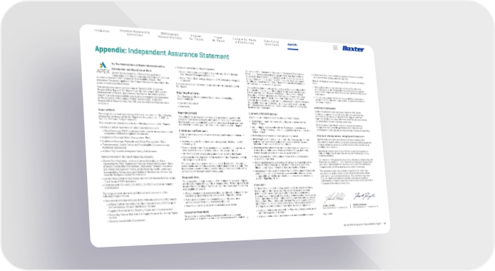 Baxter 2021 Corporate Responsibility Report 58 Appendix 2030 Corporate Responsibility Goals Corporate Responsibility Commitment Empower Our Patients Protect Our Planet Champion Our People and Communities Introduction Cross-Cutting Commitments Appendix: Independent Assurance Statement To: The Stakeholders of Baxter International Inc. Introduction and Objectives of Work Baxter International Inc. (Baxter) engaged Apex Companies, LLC (Apex) to provide assurance of selected sections of Baxter’s 2021 Corporate Responsibility Report. This Assurance Statement applies to the Subject Matter included within the scope of work described below. This information and its presentation in Baxter’s 2021 Corporate Responsibility Report (“the Report”) are the sole responsibility of the management of Baxter. Apex was not involved in the drafting of the Report. Our sole responsibility was to provide independent assurance on the accuracy of the Subject Matter. Baxter’s 2021 Corporate Responsibility Report marks the 13th year for which we have provided assurance. Scope of Work The scope of our work was reasonable-level assurance of the following information included within the Report for the period Jan. 1, 2021, to Dec. 31, 2021 (the “Subject Matter”). Data and information included in the following sections of the Report: • Achieve Carbon Neutrality for Direct Operations by 2040 > Greenhouse gas (GHG) emissions verification is documented under a separate verification opinion declaration • Implement Strategic Water Management Plans • Implement Strategic Materials and Waste Management Plans • Environmental, Health, Safety and Sustainability Governance and Additional Disclosures • Achieve Top Quartile Workplace Safety Performance Related material in the Report Appendix, including: • Baxter Data Summary—Achieve Carbon Neutrality for Direct Operations by 2040; Implement Strategic Water Management Plans; Advance Sustainable Procurement; Implement Strategic Materials and Waste Management Plans; Environmental, Health, Safety and Sustainability Governance and Additional Disclosures; Achieve Top Quartile Workplace Safety Performance • Baxter Value Chain Energy Usage and GHG Emissions (Energy, Scope 1 and Scope 2 GHG emissions) • Facilities with ISO 14001, ISO 45001, ISO 50001 and Green Building Certifications The scope of work also included limited-level assurance of the following Subject Matter: • Data and information included in the following sections of the Report: > Achieve Carbon Neutrality for Direct Operations by 2040 (Scope 3 GHG emissions, Product Distribution section) > Supplier Diversity in the Diversity, Equity and Inclusion section > Protecting Human Rights in Our Supply Chain in the Human Rights section > Advance Sustainable Procurement • Related material in the Report Appendix: > Baxter Data Summary—Supplier Diversity and GHG Emissions from Product Transport subsections > Baxter Value Chain Energy Usage and GHG Emissions—Scope 3 emissions Our assurance does not extend to any other information included in the Report. Reporting Boundaries The following are the boundaries Baxter used for reporting sustainability data: • Operational control • Worldwide Reporting Criteria The Subject Matter needs to be read and understood together with Baxter’s internal reporting requirements for facility environmental, health, safety and sustainability performance, as well as information described in the text, appendix, data tables and notes of the Report. Limitations and Exclusions Excluded from the scope of our work is any verification of information relating to: • Activities outside the defined assurance period, which is the 2021 calendar year • Positional statements (expressions of opinion, belief, aim or future intention) by Baxter and statements of future commitment • Any financial data previously audited by an external third party • Data and information included in sections of the Report not listed in the scope of work above This assurance engagement relies on a risk-based selected sample of sustainability data and the associated limitations that this entails. This independent statement should not be relied upon to detect all errors, omissions or misstatements that may exist. Responsibilities The preparation and presentation of the Subject Matter in the Report are the sole responsibility of the management of Baxter. Apex was not involved in the drafting of the Report or of the Reporting Criteria. Our responsibilities were to: • Provide independent assurance about whether the Subject Matter has been prepared in accordance with the Reporting Criteria • Form an independent conclusion based on the assurance procedures performed and evidence obtained • Report our conclusions to the stakeholders of Baxter Assessment Standards We performed our work in accordance with Apex’s standard procedures and guidelines for external Assurance of Sustainability Reports and the International Standard on Assurance Engagements (ISAE) 3000 Revised, Assurance Engagements Other than Audits or Reviews of Historical Financial Information (effective for assurance reports dated on or after Dec. 15, 2015), issued by the International Auditing and Assurance Standards Board. A materiality threshold of ±5% was set for the assurance process. The work was planned and carried out to provide reasonable, rather than absolute, assurance of the Subject Matter except for the Scope 3 GHG emissions and Product Distribution in the Achieve Carbon Neutrality for Direct Operations by 2040 section; Protecting Human Rights in Our Supply Chain in the Human Rights section; Supplier Diversity in the Diversity, Equity and Inclusion section; and the Advance Sustainable Procurement section, which was carried out to provide limited assurance. We believe that our work provides an appropriate basis for our conclusions. Summary of Work Performed As part of our independent verification, our work included: • Assessing
