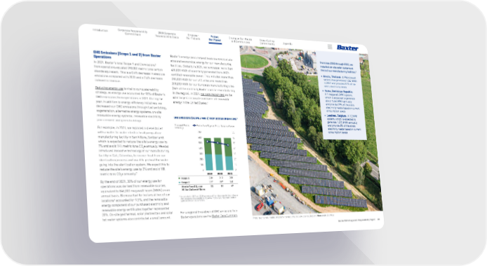 Baxter 2021 Corporate Responsibility Report 22 Protect Our Planet Corporate Responsibility Commitment Introduction 2030 Corporate Responsibility Goals Empower Our Patients Appendix Champion Our People and Communities Cross-Cutting Commitments GHG Emissions (Scope 1 and 2) from Baxter Operations In 2021, Baxter’s total Scope 1 and 2 emissions 1 from operations equaled 598,000 metric tons carbon dioxide equivalent. This is a 0.4% decrease in absolute emissions compared with 2020 and a 7.4% decrease indexed to revenue. Reducing energy use is vital to our sustainability strategy, as energy use accounted for 99% of Baxter’s GHG emissions from operations in 2021. During the year, in addition to energy-efficiency initiatives, we decreased our GHG emissions through fuel switching, cogeneration, alternative energy systems, on-site renewable energy systems, renewable electricity procurement and green buildings . For example, in 2021, we replaced a diesel boiler with a water-to-water electric heat pump at our manufacturing facility in San Vittore, Switzerland, which is expected to reduce the site’s energy use by 7% and avoid 144 metric tons CO 2 e annually. We also introduced innovative technology at our manufacturin g facility in Cali, Colombia, to recover heat from our sterilization process and use it to preheat the water going into the sterilization system. We expect this to reduce the site’s energy use by 2% and avoid 180 metric tons CO 2 e annually. 2 By the end of 2021, 30% of our energy use for operations was derived from renewable sources, equivalent to 846,000 megawatt hours (MWh) on an annual basis. Biomass fuel for boilers at two of our locations 3 accounted for 9.5%, and the renewable energy component of our purchased electricity and renewable energy certificates together represented 20%. On-site geothermal, solar photovoltaic and solar hot water systems also contributed a small amount. Baxter’s energy procurement team sources sustain - able and economical energy for our manufacturing facilities. Globally in 2021, we purchased more than 430,000 MWh of electricity generated from 100% certified renewable power. This included more than 200,000 MWh for our U.S. sites and more than 201,000 MWh for our European manufacturing sites (94% of the electricity Baxter uses for manufacturin g in the region). In 2021, we were recognized as the 43rd largest corporate purchaser of renewable energy in the United States. 4 For a regional breakdown of GHG emissions from Baxter operations see the Baxter Data Summary . From late 2020 through 2021, we installed on-site solar systems at three of our manufacturing facilities . 5 • Amata, Thailand: A 994 kilowatt system that generated 1,247 MWh in 2021 and provided 17% of the site’s electricity needs • Haina, Dominican Republic: A 1 megawatt (MW) system, which is expected to generate about 1,645 MWh annually and provide 39% of the site’s electricity needs based on current consumption levels • Lessines, Belgium: A 1.2 MW system, which is expected to generate 1,272 MWh annually and provide 8% of the site’s electricity needs based on current consumption levels GHG EMISSIONS ( SCOPE 1 AND 2 ) FROM BAXTER OPERATIONS* Thousand Metric Tons CO 2 e Metric Tons CO 2 e per Million Dollars of Sales 2019 2020 2021 Scope 1 300 313 338 Scope 2 297 287 260 Metric Tons CO 2 e per 53 51 47 Million Dollars of Sales 0 100 200 300 400 500 600 700 0 10 20 30 40 50 60 70 * Some data for 2019 and 2020 are restated from data reported in the Baxter 2020 Corporate Responsibility Report to improve accuracy and to reflect updated GHG emission factors. Photo: Solar panels installed at Baxter’s manufacturing facility in Lessines, Belgium. Photo credit: Eric Wery