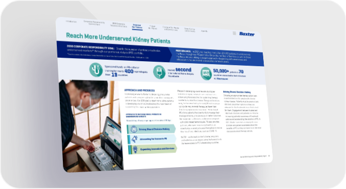 Baxter 2021 Corporate Responsibility Report 15 Empower Our Patients Protect Our Planet Appendix Champion Our People and Communities Corporate Responsibility Commitment Introduction 2030 Corporate Responsibility Goals Cross-Cutting Commitments Reach More Underserved Kidney Patients 2030 CORPORATE RESPONSIBILITY GOAL : Double the number of patients reached in underserved markets* through our peritoneal dialysis (PD) portfolio. * Countries outside of the United States, Canada, Western Europe, Japan, Korea, Australia and New Zealand. (Baseline: 198,000 patients in 2020) PERFORMANCE: In 2021, we reached more than 204,000 patients in underserved markets through our PD portfolio. Given the number of barriers to care in these markets, we are taking a staged approach—beginning with awareness and education—that we intend to accelerate in future years. APPROACH AND PROGRESS Increasing access to Baxter’s lifesaving products for patients and caregivers globally is one of our company’s top priorities. Our 2030 goal to reach more kidney patients in developing countries emphasizes the importance of supporting this underserved population. People in developing countries are at a higher risk of developing kidney disease and have less opportunity to access the life-sustaining therapy needed to survive the disease. Though estimations vary, it is believed that up to nearly 10 million people worldwide require renal therapy, yet fewer than 3 million people receive treatment. 1 Home-based PD offers patients the opportunity to manage their therapy at home, provides equal or better outcomes for many and is often less costly when compared with clinic-based hemodialysis. PD also provides patients, who have immune dysfunction, an opportunity to socially distance themselves to reduce the risk of viral infections, such as COVID-19. In 2021, we focused on the following programs and activities as we began laying the foundation to increase access to PD in developing countries. Hosted second International Home Dialysis Roundtable Sponsored hands-on PD catheter training for nearly 400 nephrologists from 19 countries 50,000+ patients in 70 countries connected to their clinicians via Sharesource APPROACH TO REACHING RENAL PATIENTS IN UNDERSERVED MARKETS We are taking a three-pronged approach to reach our 2030 goal. Empower Our Patients Protect Our Planet Appendix Champion Our People and Communities Corporate Responsibility Commitment Introduction 2030 Corporate Responsibility Goals Cross-Cutting Commitments Driving Shared Decision Making Choosing an appropriate therapy option is an important decision for people with chronic kidney disease. Patients must be aware of and informed about their options so they can advocate for the treatment choice that is best for them. Engagement between trusted and informed clinicians and patients is critical to increasing patients’ awareness of treatment options and accelerating the adoption of PD. In 2021, Baxter launched a campaign to raise clinician and patient awareness about the benefits of PD so they can have more informed discussions about therapy options. Driving Shared Decision Making Advocating for Access to PD Expanding Innovation and Services