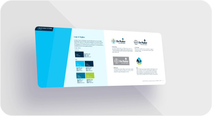 3. How to express our brands De Ruiter Logo & Tagline Our logo is made up of the Bayer Cross, De Ruiter logo type, icon and tagline. Like the Bayer logo, the De Ruiter logo is recognized by our customers, partners, retailers and employees around the world. To maintain a strong brand identity in the marketplace, it is important that any use of this logo is in accordance with the 4-color logo 1-color logo standards set forth in these guidelines at all times. Logo colors Our full-color logo is made up of Bayer brand colors. It is When a communications piece is restricted to a single or the preferred option for digital and print applications when 2-color format, the 1-color logo should be used in Bayer Logo type 4-color processing is allowed and can be used on white or Dark Blue or black. light backgrounds. Bayer PANTONE: 2380C RGB: 16/56/79 Dark Blue HEX: 10384F CMYK: 80/33/0/80 Icon Bayer Bayer Bright Blue Dark Blue PANTONE: 298C PANTONE: 2380C White logo Icon RGB: 0/188/255 RGB: 16/56/79 Our logo can be used in white on top of a dark, solid or The De Ruiter icon is a unique mark that is both a structure and HEX: 00BCFF HEX: 10384F photographic background, if there is a strong contrast a leaf combined. The blue structure represents a glasshouse CMYK: 71/0/0/0 CMYK: 80/33/0/80 between the logo and background colors. and is positioned on top of a growing environment, the green below, suggesting a protected growing environment. The icon Bayer Bayer may be used as a design element in De Ruiter communications. Mid Blue Bright Green PANTONE: 2152C PANTONE: 2299C RGB: 0/97/127 RGB: 137/211/41 50 HEX: 00617F HEX: 89D329 Approved for External Use: Vegetables by Bayer Brand Guidelines // July 2021 51 CMYK: 84/32/13/22 CMYK: 40/0/100/0