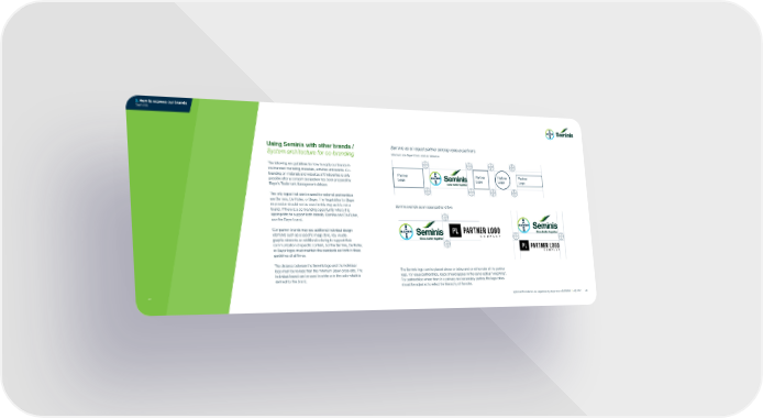 3. How to express our brands Seminis Using Seminis with other brands / Seminis as an equal partner among various partners System architecture for co-branding Minimum size Bayer Cross used as reference The following are guidelines for how to apply our brands in co-branded marketing materials, activities and events. Co- branding on materials and websites of third parties is only Partner Partner Partner Partner possible after a consent declaration has been prepared by Logo Logo Logo Logo Bayer’s Trademark Management division. The only logos that can be used for external partnerships are Seminis, De Ruiter, or Bayer. The Vegetables by Bayer expression should not be used in this way as it is not a Seminis example as an equal partner of two brand. If there is a co-branding opportunity where it is appropriate to support both brands, Seminis and De Ruiter, use the Bayer brand. Companion brands may use additional individual design elements such as a specific image style, key visuals, graphic elements or additional coloring to support their communication of specific content, but the Seminis, De Ruiter, or Bayer logos must maintain the standards set forth in these guidelines at all times. The distance between the Seminis logo and the individual logo must be no less than the minimum Bayer cross size. The The Seminis logo can be placed above or below and on either side of the partner individual brand can be used in white or in the color which is logo. For equal partnerships, logos should appear in the same optical “weighting”. defined for the brand. For partnerships where there is a primary and secondary partner, the logo ratios should be adjusted to reflect the hierarchy of the roles. 42 Approved for External Use: Vegetables by Bayer Brand Guidelines // July 2021 43