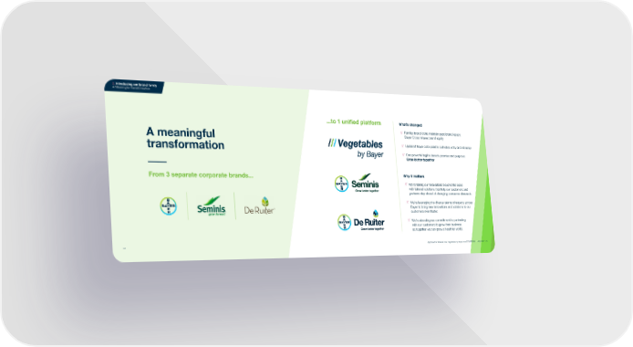2. Introducing our brand family A Meaningful Transformation ...to 1 unified platform What’s changed Familiar brand icons maintain seed brand legacy; // Bayer Cross infuses brand equity A meaningful Updated Bayer color palette cultivates unity and vibrancy transformation // One powerful tagline breeds promise and purpose: // Grow better together From 3 separate corporate brands... Why it matters // We’re taking our innovations beyond the seed with tailored solutions that help our customers and partners stay ahead of changing consumer demands. // We’re leveraging the diverse talents of experts across Bayer to bring new innovations and solutions to our customers even faster. // We’re elevating our commitment to partnering with our customers to grow their business so together we can grow a healthier world. 14 Approved for External Use: Vegetables by Bayer Brand Guidelines // July 2021 15
