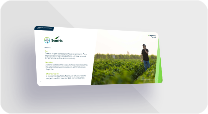 2. Introducing our brand family Seminis For: Growers in open field and greenhouse environments. From large operations to the smallest fields – all those who seek to minimize risk and maximize opportunity. We offer: A diverse portfolio of 15+ crops. But even more importantly, the advanced agronomic advice and solutions to ensure they thrive. We show up as: A true partner. Confident, trusted, we roll up our sleeves and get to work for you, your field, and your business. 18 Approved for External Use: Vegetables by Bayer Brand Guidelines // July 2021 19