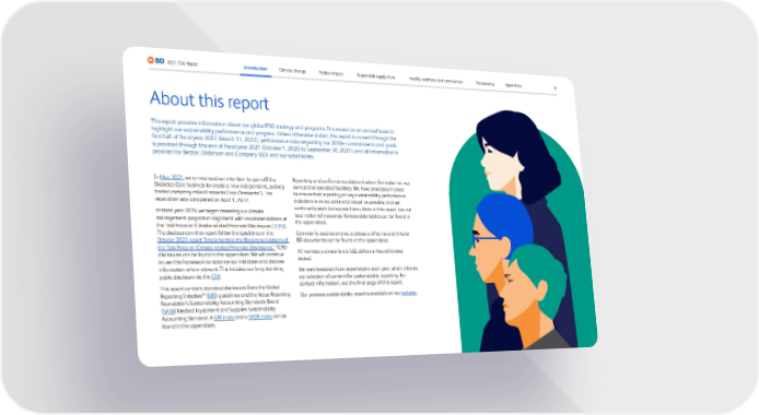 About this report This report provides information about our global ESG strategy and programs. It is issued on an annual basis to highlight our sustainability performance and progress. Unless otherwise stated, this report is current through the first half of fiscal year 2022 (March 31, 2022); performance data regarding our 2030+ commitments and goals is provided through the end of fiscal year 2021 (October 1, 2020, to September 30, 2021); and all information is provided for Becton, Dickinson and Company (BD) and our subsidiaries. In May 2021 , we announced our intention to spin off the Diabetes Care business to create a new independent, publicly traded company called Embecta Corp (“embecta”). The separation was completed on April 1, 2022. In fiscal year 2019, we began assessing our climate management program in alignment with recommendations of the Task Force on Climate-related Financial Disclosures ( TCFD ). The disclosures in this report follow the guidelines in the October 2021 report “Implementing the Recommendations of the Task Force on Climate-related Financial Disclosures.” TCFD disclosures can be found in the appendices. We will continue to use this framework to advance our initiatives and disclose information where relevant. This includes our long-standing public disclosure via the CDP . This report contains standard disclosures from the Global Reporting Initiative™ ( GRI ) guidelines and the Value Reporting Foundation’s Sustainability Accounting Standards Board ( SASB ) Medical Equipment and Supplies Sustainability Accounting Standard. A GRI index and a SASB index can be found in the appendices. Reporting and performance data includes information on our owned and operated facilities. We have processes in place to ensure that reporting on key sustainability performance indicators is as accurate and robust as possible, and we continually work to improve them. Data in this report has not been externally assured. Various data tables can be found in the appendices. Commonly used acronyms, a glossary of terms and links to BD documents can be found in the appendices. All monetary amounts are U.S. dollars unless otherwise stated. We seek feedback from stakeholders each year, which informs our selection of content for sustainability reporting. For contact information, see the final page of this report. Our previous sustainability report is available on our website . 6 2021 ESG Report Appendices Transparency Healthy workforce and communities Responsible supply chain Product impact Climate change Introduction