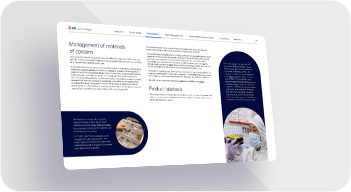 35 2021 ESG Report Appendices Transparency Healthy workforce and communities Responsible supply chain Climate change Introduction Product impact Management of materials of concern Our materials of concern list guides the way we address the reduction of MOCs across our portfolio. The list contains both regulated and nonregulated substances that we consider to be of concern and is updated twice a year. BD considers the potential impact of the materials we use in our products and packaging, and reviews customer preferences related to materials of concern in finished goods. In order to monitor the changing landscape around materials of concern among customers, regulatory bodies and advocacy groups, BD established a Chemical Review Board in 2013. This internal board, led by our director of product stewardship compliance, includes representation from R&D for each of our business units and functional expertise from toxicology. This group is equipped to evaluate the feasibility of alternative materials, provide guidance to R&D within the company, and leverage material expertise across the organization to accelerate our work to reduce MOCs from the portfolio. At the corporate level, BD has a central Product Stewardship team, led by the director of product stewardship compliance. This central team reports to the VP S&EHS. The central Product Stewardship team is in place to monitor changing global environmental regulations affecting our product portfolio, including materials of concern, and to provide governance over compliance activities carried out by our business units. The Product Stewardship team also administers our system of collecting information from suppliers through a dedicated team of supply-base compliance associates. The team also maintains our MOC list and the central database used to manage chemical information. The Product Stewardship team, and in turn our central S&EHS team, is accountable for the company’s overall system of chemicals management. They are responsible for governance over compliance with environmental regulations of products, such as REACH and RoHS. Our MOC list and additional materials for suppliers are available on our website . Product takeback Where required by law, we participate in compliance schemes to ensure the responsible collection, management and disposal (including recycling) of packaging, batteries, and electrical and electronic waste. BD actively engages in dialogue with our customers and advocacy groups to discuss the use of safer chemicals for consideration in our work to reduce priority MOCs. This engagement includes our continued response to the Chemical Footprint Project (CFP). The mission of the CFP is to transform global chemical use by measuring and disclosing data on business progress toward safer chemicals. It provides a tool for benchmarking companies as they select safer alternatives and reduce their use of chemicals of high concern. As in previous years, we have chosen to make our response public and, as such, have been recognized as a CFP 2020 Disclosure Leader. We continue to manage the end-of-life disposal of products from the BD Pyxis™ Portfolio at our San Diego, California, facility by recovering materials and components for refurbishment or recycling. In FY 2021, 20,771 units were processed through our facility, representing 1,855 metric tonnes of materials that were either refurbished, reused or recycled. No materials were disposed of via landfill.