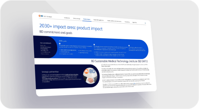 34 2021 ESG Report Appendices Transparency Healthy workforce and communities Responsible supply chain Climate change Introduction Product impact BD Sustainable Medical Technology Institute (BD SMTI) In FY 2022, BD announced the formation of the BD SMTI, which will develop and support programs to achieve our 2030+ Product Impact goals. Focused on sustainability, the institute will help guide the environmental impact reduction of our portfolio and address the sustainability needs of our customers. It will be composed of members from the R&D and ISC functions of BD, both centrally and within our business units. By focusing on three key areas—addressing Materials of Concern (MOC), new and more sustainable sterilization technologies, and sustainable product design—BD SMTI and its community of practitioners will support efforts to reduce the carbon footprint and environmental impact of our products. BD SMTI is led by the director of sustainability research and development, a new role that was established in early FY 2022. This individual reports to the senior vice president, enterprise R&D, with dotted-line reporting to the VP S&EHS. Throughout FY 2022, our central R&D team will be working with the company ERM and our business teams to calculate the greenhouse gas emissions that are generated during the use and end-of-life disposal of our products. The results will be used to set science-based targets, in line with our commitment to the UN Race to Zero. Strategic partnerships Building on our continued engagement with the Healthcare Plastics Recycling Council (HPRC) in both the United States and the European Union, and the Sustainable Healthcare Coalition (SHC) in Europe, we will develop strategic partnerships to help achieve our commitment to reducing the environmental impact of our products. 2030+ impact area: product impact BD commitment and goals 2030+ goals: Our commitment: Reduce the environmental impact of our portfolio and address the sustainability needs of our customers. 1 We will address plastic and packaging material consumption in our product portfolio through considerations in product design, including: • chemic al elimination/replacement; • mat erial reduction; • saf e product reuse models; • closed-loop r ecovery; and/or • open-loop r ecovery. 2 We will apply minimum environmental and human health criteria (based on customer EPP standards) to new products and product changes to ensure meaningful and sustainable product improvements across the life cycle. • Publish BD minimum en vironmental standards for products by end of FY 2022. • E stablish medium- and long-term targets for products to meet minimum environmental standards within 6 months of publication of the standard. 3 We will work to address the impact of plastics through existing and new strategic partnerships that work across the value chain