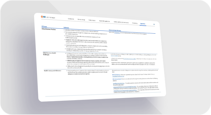 89 2021 ESG Report Transparency Appendices Responsible supply chain Product impact Climate change Introduction Healthy workforce and communities ESG issue Definition How we manage this issue Ethical Business Practices • Upholding and pr omoting high standards of ethics in business behavior. • Pr omoting ethical brand management and promotion, ethical marketing, and prevention of anti-competitive practices. • T raining associates on responsible interactions between company staff and healthcare professionals. • Engaging in sales and mark eting practices that incentivize ethical behaviors and promote truthful, non-misleading information in sales interactions with customers and the medical/ scientific community. • Impr oving Board structure and independence, executive compensation and accountability. Measuring sustainability strategy and business performance. • C omplying with state, federal and international laws pertaining to corruption and abuse, including anti-kickback laws and the U.S. Foreign Corrupt Practices Act. Refer to the Transparency section for further details on our Ethical Business Practice programs. Global Systemic Health Challenges • De veloping of treatments and medical devices that address widespread critical disease areas where there is unmet need and opportunity to prevent, diagnose and mitigate the impacts of global disease burdens, including delivering HIV/AIDS, malaria, maternal infant mortality and diabetes solutions. • A ddressing risks and opportunities that result from impacts caused by antimicrobial resistance (AMR) and continuing to prioritize AMR research and treatments with a focus on prevention, management and mitigation of disease impact. • A ddressing the risks and opportunities posed by the existing and emerging impacts that the climate has on human health. For details on how we are helping to address global systemic health challenges, including AMR, please refer to the Access to health section In March 2022, we launched BD Infectious Disease Insights to dig deeper into today’s most prominent infectious- disease trends. As part of our 2030+ commitments, we have set a goal to use our capabilities to contribute to solutions that address unmet climate-related health needs. We will provide details of progress in this area in future reports. Health Literacy and Adherence • P artnering with patients to promote their understanding of medical conditions or diseases and the reasons they are being treated, in order to improve patient outcomes through adherence to medication/treatment regimens. We provide various materials to help patients understand and manage their conditions, including web-based tools from: BD Life Sciences: Information is provided to patients about the BD Veritor™ At-Home COVID-19 Test at www.bdveritorathome.com . BD Interventional: Patients can understand and manage their Urinary Retention condition from the following websites: www.liberatormedical.com – This website provides consumers with tools to both understand their condition and choose the right product. www.purewickathome.com/ispurewickrightforme.html – This site includes information to help women who are suffering from urinary incontinence understand whether if the PureWick TM System is the right product for them. www.bardcare.com/consumers/get-answers/conditions/ – This site provides information for consumers on various conditions that the people we serve deal with on a daily basis.