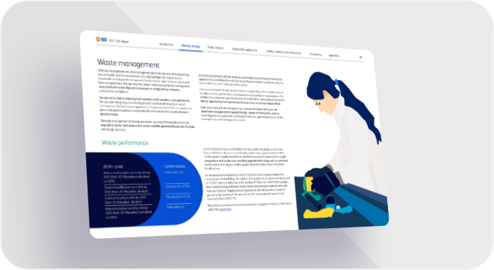 28 2021 ESG Report Introduction Climate change Appendices Transparency Healthy workforce and communities Responsible supply chain Product impact 2030+ goals: Current status: Reduce nonhazardous waste by 50% by 2030 (from 2019 baseline, normalized to COPS) Reduced by 16% Increase landfill diversion to 90% by 2030 (from 2019 baseline, absolute) Diversion rate of 79% Increase recycling to 80% by 2030 (from 2019 baseline, absolute) Recycling rate of 63% Reduce hazardous waste by 50% by 2030 (from 2019 baseline, normalized to COPS) Reduced by 6% Waste management Effective waste prevention and management practices are critical for protecting human health and the environment. BD acknowledges the importance of responsible end-disposal management for the various types of waste generated from our operations. Recognizing the current and future potential consequences associated with waste disposal is necessary to safeguard our company, communities and planet. We are committed to reducing nonhazardous and hazardous waste generation. We are examining ways to move beyond the traditional hierarchy of waste management by focusing on opportunities to prevent waste from occurring and proactively planning how to extend the life of materials that would otherwise become waste. Through management of change processes, our manufacturing locations are required to review and assess what waste would be generated by process changes and design transfers. Cross-functional teams will also evaluate source reduction and waste minimization opportunities and will partner with our waste disposal vendors to evaluate areas for waste reduction, reuse, redesign and recycling. Data associated with the generation of waste is reported by each of our locations via an online system, and this data is reviewed and monitored on an ongoing basis. This enables us to assess the type and amount of material that is being generated and to identify opportunities for improvement that can occur at a local or regional level. Risks associated with the transportation, storage and disposal of waste are identified, managed and mitigated through a series of mechanisms, such as internal governance protocols, end-disposal selection approval processes, vendor management and end-disposal site audits. Waste performance As we continue to assess and implement waste reduction projects, our efforts have resulted in a decrease in total nonhazardous waste generated in FY 2021. Facility projects implemented have included reviewing the alternatives to single- use products such as lab coats, installing upgraded technology such as combined hand-washers and -dryers to reduce paper disposal and the reuse of material- handling trays. As our practices have become more efficient, less waste requires disposal via incineration and landfilling. The volume of hazardous waste generated decreased in FY 2021 due to a reduction in the number of “clean out” events (for example, lean manufacturing and kaizen events where unnecessary material is removed from our facilities). Regulated waste generation also decreased as a result of greater understanding of the precautions that were required to protect our associates from COVID-19. Waste data and information on how we define categories of waste can be found within the appendices .