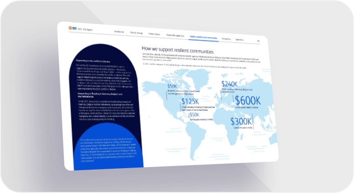 64 2021 ESG Report Transparency Responsible supply chain Product impact Climate change Introduction Healthy workforce and communities Appendices $125K Flood recovery in the Gulf Coast and the East Coast of the United States $50K Relief for veterans in the United States and refugees from Afghanistan $240K Flood recovery in Germany, Belgium and the Netherlands $50K Earthquake recovery in Haiti $600K Humanitarian relief in Ukraine $300K COVID-19 relief in India How we support resilient communities For more than a decade, BD has partnered with international relief agencies including the American Red Cross, Direct Relief, AmeriCares, MAP International, CMMB and Heart to Heart International to deploy product donations and cash support quickly and efficiently to build the resiliency of communities worldwide as they work to recover from disasters, pandemics and conflict. In 2021 and the early part of 2022, philanthropic cash and product donations from the BD Foundation were deployed to regions around the world. Responding to the conflict in Ukraine: BD and the BD Foundation committed $600,000 in cash to support our trusted international relief partners—Americares, International Medical Corps and Project HOPE—in their response to the humanitarian crisis caused by the conflict in Ukraine. This cash support helped expand access to emergency healthcare services, mobile medical units, essential medicines and medical supplies. BD employees also contributed more than $90,000 to the BD Associate Relief Fund, which provided a total of 90 grants to BD colleagues who were impacted by the 2022 conflict in Ukraine. Responding to flooding in Germany, Belgium and the Netherlands: In July 2021, heavy rains caused devastating flooding in regions of Germany, Belgium and the Netherlands, causing tragic loss of life and widespread destruction of property and infrastructure. BD and the BD Foundation together donated $240,000 to the disaster response effort in the region, and more than a dozen BD associates served as volunteer firefighters who worked tirelessly to save and serve families whose lives or homes were endangered by the flooding. “It is really hard to put into words the impact the floods had on our community...the floods stopped at nothing. Whole houses were washed away,” said Hermann Sicken, BD Environment, Health and Safety Specialist who serves as chief fire officer in a volunteer firefighter brigade that responded to extensive flooding in Kelberg, Germany. “I see firefighting as a passion and a certain duty to help other people. It is an indescribable feeling when you are able to save someone.”