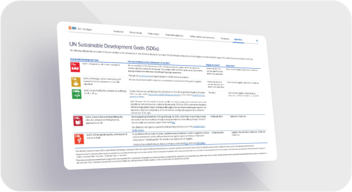 92 2021 ESG Report Transparency Appendices Responsible supply chain Product impact Climate change Introduction Healthy workforce and communities UN Sustainable Development Goals (SDGs) The following table provides an outline of how we contribute to the achievement of each SDG, how directly BD can impact the SDG through core business activities (degree of control) and which stages of BD’s value chain are most relevant to the SDG. Sustainable Development Goal How we contribute to the achievement of the SDG 23 Degree of control 24 Value chain 25 Goal 1. End poverty in all its forms everywhere We can contribute to the achievement of this SDG by ensuring that workers within our operations and our value chain are paid a living wage. For example, under our 2030+ goals, we are committed to paying competitive market rates and utilizing living-wage assessments. Through our social investing , we support programs to build community resilience. Moderately direct for our own operations, less direct in our value chain Raw materials, Suppliers, Operations, Distribution Goal 2. End hunger, achieve food security and improved nutrition and promote sustainable agriculture We have determined that BD’s impact on, or contribution to achievement of, this goal is negligible. Moderately direct for our own operations, less direct in our value chain Raw materials, Suppliers, Operations, Distribution Goal 3. Ensure healthy lives and promote well-being for all at all ages Details of how we are contributing to the achievement of this SDG are provided throughout this report. Other examples include women-focused philanthropic investments and our work on hospital infection prevention efforts. Goal 3.9 requires that the number of deaths and illnesses from hazardous chemicals and air, water and soil pollution and contamination is substantially reduced by 2030. Our 2030+ commitments regarding climate change, product impact and responsible supply chain are aimed at reducing the impact of our operations, value chain and products on the environment, thereby reducing potential to undermine achievement of this goal. Very direct Raw materials, Suppliers, Inbound logistics, Operations, Distribution, Product use, End of life Goal 4. Ensure inclusive and equitable quality education and promote lifelong learning opportunities for all We are supporting achievement of this goal through our 2030+ commitment to proactively manage the needs of our future workforce through training, development and re-skilling strategies. Details of how we enable our associates to grow can be found here . We collaborate with agencies around the world, providing training to assist in the strengthening of health systems . Moderately direct Operations, Product use Goal 5. Achieve gender equality and empower all women and girls In accordance with our Code of Conduct, we believe everyone deserves to work in a supportive, inclusive and safe environment, and we will never discriminate against anyone on the basis of “protected characteristics,” including gender. This extends to our Expectations for Suppliers. Details on how we build inclusion, diversity and equity can be found here and in our ID&E Report . Moderately direct Suppliers, Inbound logistics, Operations, Distribution, Product use 23 The rationale is based on a review of BD’s current activities and strategies, considering (a) the risks to people and the environment linked to our company’s operations and value chain; and (b) actual and potential positive impacts or benefits of products, services and investments related to the SDGs. 24 Degree of control is assessed by determining how directly BD can impact the SDG through its core business activities. While some targets will benefit from BD’s direct involvement, others are more relational and will benefit from BD’s overall influence or through parties and stakeholders other than BD itself. The degree of control is considered either “very direct,” “moderately direct,” or “less direct.” 25 Value-chain impacts were assessed based on where in BD’s value chain the SDG is most relevant. The greatest social and environmental impact that BD has on the SDGs may be beyond the scope of the assets it owns or controls, with the greatest business opportunities being potentially further upstream or downstream in the value chain. This is a high-level mapping of BD’s value chain to identify areas with high likelihood of either negative or positive impacts on the issues that the SDGs represent.