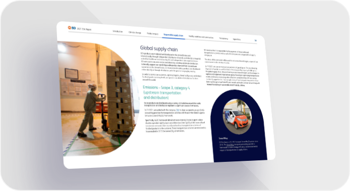 50 2021 ESG Report Appendices Transparency Healthy workforce and communities Product impact Climate change Introduction Responsible supply chain Global supply chain BD’s products are marketed and distributed in the United States and internationally through independent distribution channels, and directly to hospitals and other healthcare institutions by BD and independent sales representatives. BD uses acute care, non-acute care, laboratory and drug wholesale distributors to broadly support our overall disposable product demand from our end-user customers in the United States. In international markets, products are distributed either directly or through distributors, with the practice varying by country. In order to service our customers, optimize logistics, lower facility costs and reduce finished goods inventory levels, we operate consolidated distribution facilities around the world. Emissions – Scope 3, category 4 (upstream transportation and distribution) As our products are distributed using a variety of modalities around the world, transportation and distribution represent a significant source of emissions. In FY 2021, we worked with the company ERM to align our greenhouse gas (GHG) accounting practices for transportation activities with those of the Global Logistics Emissions Council (GLEC) Framework. Specifically, GLEC Framework default emission-intensity factors in gram carbon dioxide equivalent (gCO 2 e) per tonne-kilometer (t-km) (g CO 2 e/t-km) were utilized to estimate emissions from air, rail, road and sea transportation activities of finished products to the customer. These transportation activities are estimated to have resulted in 317,124 tonnes CO 2 e of emissions. BD assumes that it is responsible for the payment of these outbound transportation activities and, as such, the emissions are categorized as Scope 3, category 4. This data, while estimated, will be used to set science-based targets, as part of our commitment to the UN Race to Zero. In FY 2021, we saw an increase in movement of goods by air. This was driven by shipment of products used for COVID-19 testing and by capacity challenges in the global supply chain. Ahead of setting science-based targets, we have begun to explore and implement improvement plans, focusing on optimizing transportation modes and routes; increasing cube utilization; and partnering with our carriers to identify opportunities. For example, many of our transportation partners have been switching to more fuel-efficient vessels and trucks, and we are watching with interest the testing of sustainable aircraft fuels by airlines. SmartWay: BD has been a U.S. EPA Transport SmartWay ® partner since 2010. The SmartWay transport partnership provides a framework to assess energy-efficiency and environmental impact of transportation in supply chains.