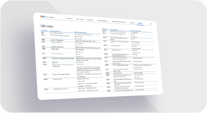 105 2021 ESG Report Transparency Appendices Responsible supply chain Product impact Climate change Introduction Healthy workforce and communities GRI index GRI Disclosure Disclosure requirement Response or disclosure location 102-1 Name of the organization Becton, Dickinson and Company (BD) 102-2 Activities, brands, products and services About our business 2021 Form 10-K 102-3 Location of headquarters 1 Becton Drive, Franklin Lakes, NJ 07417 USA 102-4 Location of operations About our business 2021 Form 10-K 102-5 Ownership and legal form Publicly traded on the New York Stock Exchange as BDX 102-6 Markets served About our business 2021 Form 10-K 102-7 Scale of the organization About BD 2021 Form 10-K 102-8 Information on employees and other workers Healthy workforce and communities – Inclusion, diversity and equity and data tables 102-9 Supply chain 2021 Form 10-K 102-10 Significant changes to the organization and its supply chain 2021 Form 10-K In May 2021, we announced our intention to spin off our Diabetes Care business into a new independent, publicly traded company called embecta. The spin-off was completed in April 2022. 102-11 Precautionary principle or approach Product impact – Management of materials of concern TCFD disclosures 102-12 External initiatives Alignment with the SDGs Climate change Product impact – Laboratory animal welfare Transparency – Human rights 102-13 Membership of associations Product impact – Strategic partnerships Product impact – Inspiring quality in industry GRI Disclosure Disclosure requirement Response or disclosure location 102-14 Statement from senior decision-maker To our stakeholders 102-15 Key impacts, risks and opportunities ESG Issues TCFD disclosures 102-16 Values, principles, standards and norms of behavior About BD 102-17 Mechanisms for advice and concerns about ethics Ethics and compliance BD Code of Conduct 102-18 Governance structure ESG strategy 2022 Proxy Statement 102-19 Delegating authority ESG strategy 2022 Proxy Statement 102-20 Executive-level responsibility for economic, environmental, and social topics ESG strategy 102-21 Consulting stakeholders on economic, environmental and social topics Stakeholder engagement 102-22 Composition of the highest governance body and its committees 2022 Proxy Statement 102-23 Chair of the highest governance body Tom Polen is Chair of the Board and CEO of BD. 2022 Proxy Statement 102-24 Nominating and selecting the highest governance body 2022 Proxy Statement 102-25 Conflicts of interest 2022 Proxy Statement 102-26 Role of highest governance body in setting purpose, values and strategy 2022 Proxy Statement ESG strategy 102-27 Collective knowledge of highest governance body 2022 Proxy Statement 102-28 Evaluating the highest governance body’s performance 2022 Proxy Statement 102-29 Identifying and managing economic, environmental and social impacts 2022 Proxy Statement 102-30 Effectiveness of risk management processes 2022 Proxy Statement