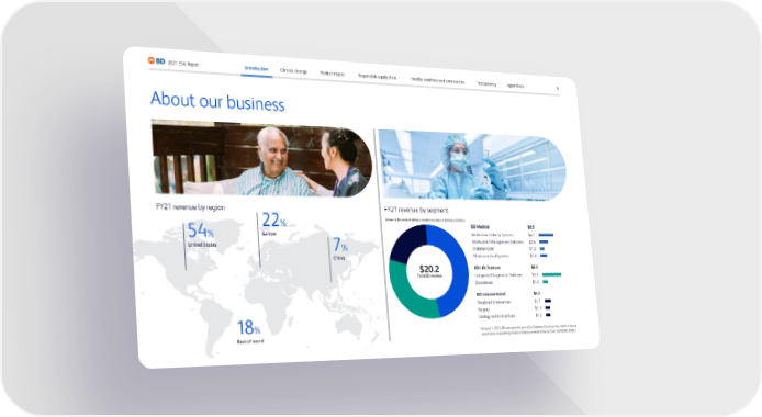 About our business 54 % United States 22 % Europe 7 % China 18 % Rest of world FY21 revenue by segment Values in this exhibit reflect rounded numbers in billions of dollars $20.2 Total BD revenue BD Medical Medication Delivery Systems Medication Management Solutions Diabetes Care* Pharmaceutical Systems $9.5 $4.1 $2.4 $1.2 $1.8 BD Life Sciences Integrated Diagnostics Solutions Biosciences $6.5 $5.2 $1.3 BD Interventional Peripheral Intervention Surgery Urology and Critical Care $4.2 $1.7 $1.3 $1.2 * On April 1, 2022, BD e xecuted the spin of its Diabetes Care business, which is now a stand-alone and publicly traded company named Embecta Corp. (NASDAQ: EMBC). FY21 revenue by region 9 2021 ESG Report Appendices Transparency Healthy workforce and communities Responsible supply chain Product impact Climate change Introduction