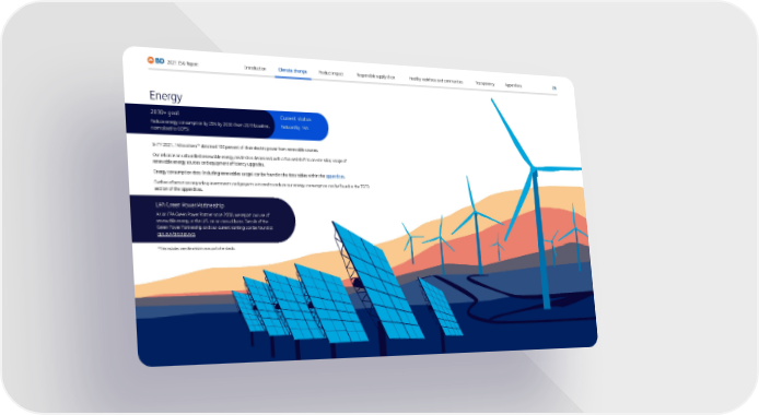26 2021 ESG Report Introduction Climate change Appendices Transparency Healthy workforce and communities Responsible supply chain Product impact Energy Current status: Reduced by 14% 2030+ goal: Reduce energy consumption by 25% by 2030 (from 2019 baseline, normalized to COPS) In FY 2021, 14 locations 10 obtained 100 percent of their electric power from renewable sources. Our reliance on unbundled renewable energy credits has decreased, with a focused shift to on-site solar, usage of renewable energy sources and equipment efficiency upgrades. Energy consumption data (including renewables usage) can be found in the data tables within the appendices . Further information regarding investments and projects initiated to reduce our energy consumption can be found in the TCFD section of the appendices. EPA Green Power Partnership As an EPA Green Power Partner since 2008, we report our use of renewable energy in the U.S. on an annual basis. Details of the Green Power Partnership and our current ranking can be found at epa.gov/greenpower. 10 This includes one site which is now part of embecta.