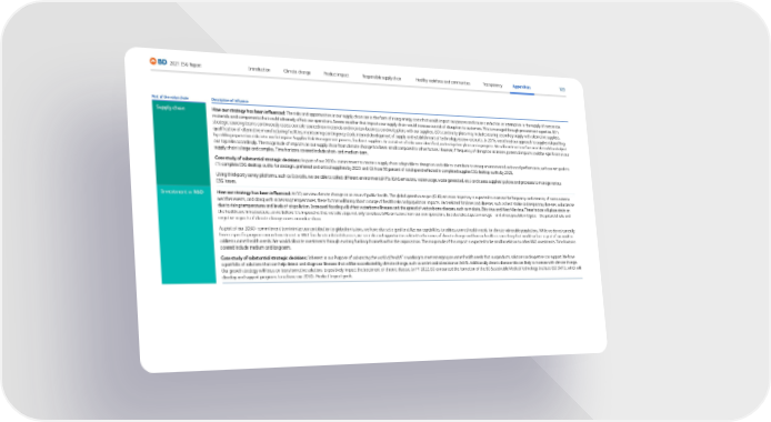 123 2021 ESG Report Transparency Appendices Responsible supply chain Product impact Climate change Introduction Healthy workforce and communities Part of the value chain Description of influence Supply chain How our strategy has been influenced: The risks and opportunities in our supply chain are in the form of rising energy costs that would impact our process and cause a reduction or interruption in the supply of certain raw materials and components that could adversely affect our operations. Severe weather that impacts our supply chain would increase our risk of disruption to customers. This is managed through procurement expertise. BD’s strategic sourcing teams continuously assess our sole-sourced raw materials and maintain business continuity plans with our suppliers. BD’s continuity plans may include securing secondary supply with alternative suppliers, qualification of alternative manufacturing facilities, maintaining contingency stock, internal development of supply and establishment of technology escrow accounts. In 2016, we refined our approach to supplier risk profiling by adding reputation risks into our Enterprise Supplier Risk Management process, for direct suppliers. An initial set of risks were identified, and mitigation plans are in progress. We will continue to refine our risk model and adjust our top risks accordingly. The magnitude of impacts on our supply chain from climate change has been small compared to other factors. However, if frequency of disruption increases, potential impacts could be significant as our supply chain is large and complex. Time horizons covered include short- and medium-term. Case study of substantial strategic decisions: As part of our 2030+ commitment to create a supply chain adaptable to disruption and able to contribute to strong environmental and social performance, we have set goals to (1) complete ESG desktop audits for strategic, preferred and critical suppliers by 2023 and (2) have 90 percent of total spend reflected in completed supplier ESG desktop audits by 2025. Using third-party survey platforms, such as Ecovadis, we are able to collect different environmental KPIs (GHG emissions, water usage, waste generated, etc.) and assess suppliers’ policies and processes to manage various ESG issues. Investment in R&D How our strategy has been influenced: At BD, we view climate change as an issue of public health. The global greenhouse gas (GHG) emission trajectory is expected to increase the frequency and intensity of some extreme weather events, and along with increasing temperatures, these factors will bring about a range of health risks and population impacts. Heat-related fatalities and illnesses, such as heat stroke and respiratory illnesses, will increase due to rising temperatures and levels of air pollution. Increased flooding will affect waterborne illnesses and the spread of vector-borne diseases, such as malaria, Zika virus and West Nile virus. These factors will place strain on the healthcare infrastructure, so we believe it is imperative that we take steps not only to reduce GHG emissions from our own operations, but also take steps to manage—and where possible mitigate—the potential risks and negative impacts of climate change across our value chain. As part of our 2030+ commitment to minimize our contribution to global emissions, we have also set a goal to utilize our capabilities to address unmet health needs for climate-vulnerable populations. While w e do not currently have a specific program around investment in R&D for climate-related diseases, we see risks and opportunities related to the nexus of climate change and human health as something that would surface as part of our work to address unmet health needs. We would allocate investments through existing funding channels within the organization. The magnitude of this impact is expected to be small in relation to other R&D investments. Time horizons covered include medium and long-term. Case study of substantial strategic decisions: Inherent in our Purpose of advancing the world of health ™ is working to meet emerging or unmet health needs that our products, solutions and expertise can support. We have a portfolio of solutions that can help detect and diagnose illnesses that will be exacerbated by climate change, such as antimicrobial resistance (AMR). Additionally chronic disease risks are likely to increase with climate change. Our growth strategy will focus on transformative solutions to positively impact the treatment of chronic disease. In FY 2022, BD announced the formation of the BD Sustainable Medical Technology Institute (BD SMTI), which will develop and support programs to achieve our 2030+ Product Impact goals.