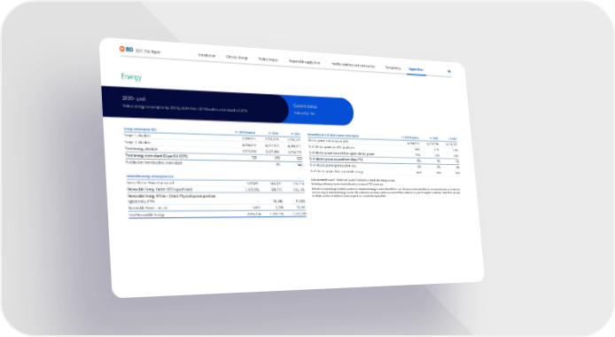 98 2021 ESG Report Transparency Appendices Responsible supply chain Product impact Climate change Introduction Healthy workforce and communities 2030+ goal: Reduce energy consumption by 25% by 2030 (from 2019 baseline, normalized to COPS) Current status: Reduced by 14% Energy Energy consumption (GJ) FY 2019 baseline FY 2020 FY 2021 Scope 1, absolute 2,269,013 2,250,019 2,358,321 Scope 2, absolute 4,264,033 4,227,975 4,388,011 Total energy, absolute 6,533,046 6,477,994 6,746,332 Total energy, normalized (GJ per $M COPS) 726 679 623 % reduction from baseline, normalized 6% 14% Renewable energy consumption (GJ) Green Electric Power Consumed 620,491 686,801 716,114 Renewable Energy Credits (RECs) purchased 1,430,286 459,715 434,128 Renewable Energy Offsite – Direct (Physical) power purchase agreements (PPA) — 50,345 61,886 Renewable Power – on-site 5,457 5,294 10,241 Total Renewable Energy 2,056,234 1,202,156 1,222,369 Renewables as % of electric power consumption FY 2019 baseline FY 2020 FY 2021 Electric power consumption (GJ) 4,264,033 4,218,194 4,374,787 % of electric power via REC purchases 34% 11% 10% % of electric power sourced from green electric power 15% 16% 16% % of electric power sourced from direct PPA 0% 1% 1% % of electric power generated on-site 0% 0% 0% % of electric power from renewable energy 48% 28% 28% Data represents Scope 1 (direct) and Scope 2 (indirect from electricity) energy sources. Breakdown of energy sources can be found in our annual CDP submission. Reduction in percentage of electric power from renewable energy is due to the shift from our reliance on unbundled RECs to a focused reliance on on-site solar and sourcing of renewable energy sources. We continue to purchase a certain amount of RECs in the U.S., as part of long-term contracts. These RECs are used to offset a portion of electrical power usage at our manufacturing facilities.
