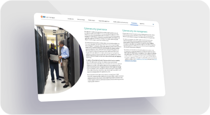 84 2021 ESG Report Healthy workforce and communities Appendices Responsible supply chain Product impact Climate change Introduction Transparency Cybersecurity governance Our approach to cybersecurity governance includes aligning cybersecurity risk management, policy and compliance initiatives with business objectives so that information assets and technologies used in BD products, manufacturing, service, enterprise IT and third-party components are secure, resilient and compliant with applicable regulatory and industry standards. This includes cybersecurity due diligence for BD mergers, acquisitions and divestitures. BD Information Security policies and procedures are reviewed annually by cross- functional stakeholders specializing in information security, integrated supply chain, enterprise IT and quality. Additionally, cybersecurity risks and their potential impact on BD, customers and patients are reviewed by the company’s central, regional and business teams, and information security provides guidance for identifying, prioritizing and mitigating such risks. Cybersecurity risks are also integrated into our approach to enterprise risk management, and significant cybersecurity risks are communicated to the Executive Leadership team and the Board of Directors through the Audit Committee and the Quality and Regulatory Committee. In addition, BD provides the Board of Directors and the Executive Leadership team with cybersecurity training. This includes annual scenario-based cybersecurity training in providing effective oversight in the event of a significant cybersecurity incident, and targeted cybersecurity training opportunities such as the National Association of Corporate Directors (NACD) Cyber-risk Oversight Certificate program, which is designed to enhance participants’ understanding of the cybersecurity threat landscape, cyber-risk oversight responsibilities and organizational preparedness for cybersecurity crises. We also provide annual cybersecurity awareness training for our 75,000 associates, comprising online cybersecurity training modules; in-person and virtual cybersecurity bootcamp classes; contextual phishing simulation exercises; mock incident response exercises; and intranet resources aimed at enhancing associates’ ongoing cyber-awareness. Cybersecurity risk management BD proactively monitors for suspicious activity, including phishing attacks, malware and ransomware attacks, insider threats and human error. Our monitoring and detection systems block an average of 14.4 million malicious activities per month. Our cybersecurity program also includes regular internal and external security audits and vulnerability assessments; penetration testing of the company’s systems, products and practices; third-party risk assessments; threat intelligence investigations; vulnerability scanning and management; and incident management. We also leverage threat modeling to uncover and examine potential cybersecurity risks during the design process and beyond. BD maintains consistent practices for reporting cybersecurity incidents to the U.S. government, including the Cybersecurity and Infrastructure Security Agency (CISA) and/or the Federal Bureau of Investigation (FBI). In addition, BD welcomes vulnerability reports from customers, security researchers, third-party component vendors and other external groups that wish to report a potential vulnerability in a BD software-enabled device. Our approach to vulnerability reporting and disclosure is publicly available at the BD Cybersecurity Trust Center and noted in the BD 2021 Cybersecurity Annual Report .