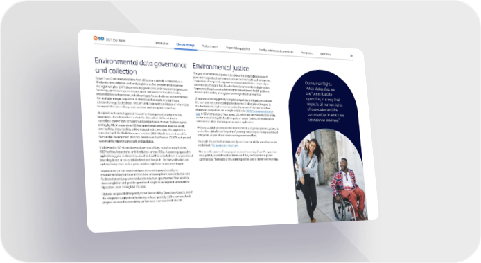 30 2021 ESG Report Introduction Climate change Appendices Transparency Healthy workforce and communities Responsible supply chain Product impact Our Human Rights Policy states that we are “committed to operating in a way that respects all human rights of associates and the communities in which we operate our business.” Environmental data governance and collection Scope 1 and 2 environmental data from all locations globally is collected via a third-party data collection and analysis platform. Our environmental inventory management plan (IMP) documents key governance and measurement processes for energy, greenhouse gas emissions, water and waste. It also defines roles, responsibilities and processes, including triggers for recalculation and restatement (for example, merger, acquisition or divestiture that results in a significant structural change to the data). The IMP seeks to provide confidence of information to support decision-making, and consistent and transparent reporting. An operational control approach is used for the purpose of setting inventory boundaries. These boundaries include facilities where BD has at least a controlling interest from an operational perspective or, at most, facilities owned entirely by BD. In cases where BD has operational control but does not wholly own facilities, these facilities will be included in the inventory. This approach is consistent with the World Resources Institute (WRI)/World Business Council for Sustainable Development (WBCSD) Greenhouse Gas Protocol (GHGP) and general sustainability reporting protocols and guidance. Facilities within BD's boundaries include main offices, manufacturing facilities, R&D facilities, laboratories and distribution centers (DCs). A screening approach is applied every year to determine sites that should be excluded from the operational boundary based on an established material threshold. The threshold values are updated every three to four years, or when significant acquisitions happen. Improvements in our operational practices and improved visibility to environmental performance metrics have encouraged emissions reduction and facilitated identifying water and waste reduction opportunities. Sites report on data completion and provide operational insight to our regional Sustainability Operations team throughout the year. Updates are provided frequently to our Sustainability Operations Council, and of the integrated supply chain leadership at least quarterly. At the company level, progress on overall sustainability performance is reviewed with the ERC. Environmental justice The goal of environmental justice is to address the inequitable exposure of poor and marginalized communities to harm to their health and environment. The pattern of inequitable exposure to environmental harms—especially in communities of color in the U.S.—has been documented in multiple studies. Exposure to these harms has led to higher rates of chronic health problems, disease and mortality among poor and marginalized communities. Efforts are continuing globally to implement policies and legislation to ensure the fair treatment and meaningful involvement of all people with respect to the development, implementation and enforcement of environmental laws, regulations and policies. An example includes the 2020 Environmental Justice Law in BD’s home state of New Jersey, U.S., which requires the evaluation of the environmental and public health impacts of certain facilities on overburdened communities when reviewing certain permit applications. We have established environmental and health & safety management systems at our facilities globally that help identify, manage and mitigate environmental and safety risks, as part of our continuous improvement efforts. Oversight of identified environmental justice issues would be carried out via our established ESG governance structures. We are in the process of carrying out an initial screening of our U.S. operations using publicly available tools to determine if they are located in impacted communities. The results of this screening will be used to determine next steps.