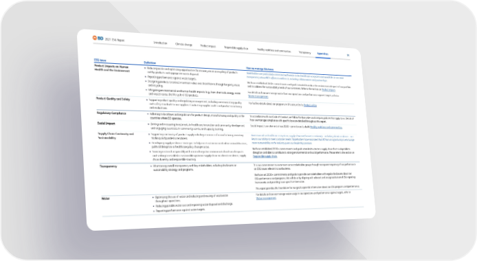 91 2021 ESG Report Transparency Appendices Responsible supply chain Product impact Climate change Introduction Healthy workforce and communities ESG issue Definition How we manage this issue Product Impacts on Human Health and the Environment • R educing waste and optimizing opportunities for recovery, reuse or recycling of products and by-products and appropriate waste disposal. • R eporting performance against waste targets. • Designing pr oducts to extract maximum value over their lifetime through longevity, reuse and recycling. • Mitigating en vironmental and human health impacts (e.g., from chemicals, energy, water and waste) across the life cycle of BD products. Stakeholders are particularly concerned with waste in the healthcare ecosystem and would like to see more transparency about BD’s efforts to address it, including collaborations and partnerships. We have established 2030+ commitments and goals intended to reduce the environmental impact of our portfolio and to address the sustainability needs of our customers. Refer to the section on Product impact . For details on how we manage waste from our operations and performance against targets, refer to Waste management . Product Quality and Safety • Supporting r obust quality and regulatory management, including communicating quality and safety standards to our suppliers. Conducting supplier audits and product monitoring and evaluations. For further details about our programs in this area, refer to Product safety . Regulatory Compliance • A dhering to local laws and regulations for product design, manufacturing and quality in the countries where BD operates. In accordance with our Code of Conduct, we follow the laws, rules and company policies that apply to us. Details of how we manage compliance with specific laws are detailed throughout this report. Social Impact • Driving and measuring in vestments in healthcare innovation and community development and engaging associates in community service and capacity training. Social impact is an element of our 2030+ commitment to build Healthy workforce and communities . Supply Chain Continuity and Sustainability • Supporting c ontinuity of product supply including assurance of manufacturing, inventory tracking and pandemic readiness. • De veloping supply resilience strategies to help meet customer needs when natural disasters, political disruption or healthcare policy changes occur. • Sour cing materials responsibly with minimal negative environmental and social impacts and seeking to establish a sustainable upstream supply chain via climate resilience, supply chain diversity and responsible sourcing. Given our role in healthcare ecosystem, supply chain and business continuity—including climate resilience—are key to our ability to meet customer needs. Stakeholders have indicated that BD has an opportunity to encourage more sustainability in the industry given our leadership position. We have established 2030+ commitments and goals intended to create a supply chain that is adaptable to disruption and able to contribute to strong environmental and social performance. Please refer to the section on Responsible supply chain . Transparency • Maint aining overall transparency with key stakeholders, including disclosures on sustainability strategy and programs. It is our commitment to invite trust across stakeholder groups through transparent reporting of our performance on ESG issues relevant to our business. We have set 2030+ commitments and goals to provide our stakeholders with regular disclosures about our ESG performance and programs. We will do so by aligning with relevant and recognized external ESG reporting frameworks and providing issue-specific information. This report provides the foundation for our goal to provide information about our ESG programs and performance. Water • Optimizing the use of w ater and reducing and reusing of wastewater throughout operations. • R educing potable water use and improving water disposal and discharge. • R eporting performance against water targets. For details on how we manage water usage in our operations and performance against targets, refer to Water management .