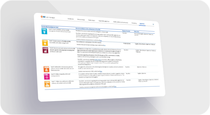 93 2021 ESG Report Transparency Appendices Responsible supply chain Product impact Climate change Introduction Healthy workforce and communities Sustainable Development Goal How we contribute to the achievement of the SDG Degree of control Value chain Goal 6. Ensure availability and sustainable management of water and sanitation for all We believe that access to water, sanitation and hygiene is a human right. Our 2030+ commitments regarding climate change, product impact and responsible supply chain are aimed at reducing the impact of our operations, value chain and products on water, thereby reducing potential to undermine achievement of this goal. Details on how we manage water use can be found here . Very direct Raw materials, Suppliers, Operations, Product use, End of life Goal 7. Ensure access to affordable, reliable, sustainable and modern energy for all Our contribution to achievement of this SDG is neutral. Details on how we manage our energy usage can be found here . Moderately direct Suppliers, Inbound logistics, Operations, Distribution Goal 8. Promote sustained, inclusive and sustainable economic growth, full and productive employment and decent work for all Our Global Human Rights Policy is guided by the principles outlined in the UN Declaration of Human Rights and International Labor Organization’s Declaration on Fundamental Principles and Rights at Work. This commitment extends beyond BD processes and practices to those in our supply chains. We are also supporting achievement of this SDG through our 2030+ commitments to a healthy workforce and community and programs such as our Good Jobs Strategy. Our 2030+ commitments regarding Product Impact are aimed at addressing plastic and packaging consumption in our product portfolio, thereby reducing potential to undermine achievement of this goal, specifically the target to improve resource efficiency and decouple growth from environmental degradation. Very direct Suppliers, Inbound logistics, Operations, Distribution, Product use Goal 9. Build resilient infrastructure, promote inclusive and sustainable industrialization and foster innovation We support the achievement of this SDG through our development of products and services related to healthcare and medical research. Details of our investment in R&D can be found here . Very direct Operations, Product use Goal 10. Reduce inequality within and among countries In accordance with our Code of Conduct, we believe everyone deserves to work in a supportive, inclusive and safe environment, and we will never against anyone on the basis of “protected characteristics.” This extends to our Expectations for Suppliers. Very direct Suppliers, Operations Goal 11. Make cities and human settlements inclusive, safe, resilient and sustainable Our 2030+ commitments regarding climate change, product impact and responsible supply chain are aimed at reducing the impact of our operations, value chain and products on the environment, thereby reducing potential to undermine achievement of this goal. Details on our waste management and air emissions programs can be found here . Very direct Suppliers, Inbound logistics, Operations, Distribution, Product use, End of life