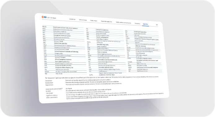 129 2021 ESG Report Transparency Appendices Responsible supply chain Product impact Climate change Introduction Healthy workforce and communities MAUDE Manufacturer and User Facility Device Experience MDIC Medical Device Innovation Consortium MDR Medical device regulation MES Manufacturing execution system MIS Management information system MNT Maternal and neonatal tetanus MOC Materials of Concern MOH Ministry of Health MSS Medical Safety Specialists NACD National Association of Corporate Directors NGO Nongovermental organizations NIH National Institutes of Health NIST National Institute of Standards and Technology NOX Nitrogen oxides NTEP National TB Elimination Program NTP National TB Program ODA Official Development Assistance ODS Ozone-depleting substances OEM Original equipment manufacturer OHS Occupational health and safety OIFR Occupational illness frequency rate PAC Political action committee PEPFAR President’s Emergency Plan for AIDS Relief POC Point of care PPA Power purchase agreements PPE Personal protective equipment QAN Quality Audit Network QMS Quality management system R&D Research and development RCSI Royal College of Surgeons REACH Registration, Evaluation, Authorisation and Restriction of Chemicals REC Renewable Energy Credits RFP Request for proposal RMW Regulated Medical Waste RoHS Restriction of Hazardous Substances Directive ROI Return on investment RRA Remote Regulatory Assessment S&EHS Sustainability and environment, health and safety SAB Scientific Advisory Board SASB Sustainability Accounting Standards Board SBTi Science Based Targets initiative SDS Safety Data Sheets SEC Securities and Exchange Commission SHC Sustainable Healthcare Coalition SHEA Society for Healthcare Epidemiology of America SKU Stock keeping unit SLIPTA Stepwise Laboratory Improvement Process Towards Accreditation in the African Region SOPs Standard operating procedures SOP Strategic Organizational Plan SOX Sulfur oxides STEM Science, Technology, Engineering, and Math STRIDES Strengthening TB Resistance Testing and Diagnostic Systems SVP Senior vice president TB Tuberculosis TCFD Task Force on Climate-related Financial Disclosures UL Underwriters’ Laboratories UN SDGs United Nations Sustainable Development Goals UNICEF United Nations International Children’s Emergency Fund USAID U.S. Agency for International Development VoA Voice of the Associate VOC Volatile organic compounds VP Vice president VP GCA Vice President of Global Clinical Affairs VP S&EHS Vice President, Sustainability and Environment, Health and Safety VST Volunteer Service Trip WARM Waste Reduction Model WBCSD World Business Council for Sustainable Development WHO World Health Organization WRI World Resources Institute The “strong teams” operating model outlines our approach to how different parts of the organization can come together to deliver value. The foundation for this model is empowerment of teams and servant leadership. At the center are our customers. Central team These teams are typically corporate functions and drive people, process and systems excellence. Business team These teams drive strategy and product portfolio. The teams are arranged by segment, business unit and platform. Regional team These teams are focused on channels, customers and service. The teams are arranged by region, country and sales team. Advancing the world of health TM Our Purpose. BD 2025 Our current phase of value creation, anchored in three key pillars—Grow, Simplify and Empower. THE BD WAY A set of behaviors that embodies who we are, what we stand for and why we exist. Together we advance Our ESG strategy, a four-pillar framework through which we address the most relevant ESG issues for our business and stakeholders. 2030+ commitments A set of commitments and goals in five impact areas—climate change, product impact, responsible supply chain, healthy workforce and communities, and transparency. These are areas where we see the most opportunity for BD to create meaningful and measurable change over the next decade and beyond.