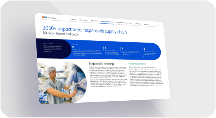 44 2021 ESG Report Appendices Transparency Healthy workforce and communities Product impact Climate change Introduction Responsible supply chain Responsible sourcing Our 2030+ commitments and goals recognize that a significant way BD can reduce our impact is through what materials and goods we buy and how we buy them. Our Responsible Sourcing program was established to work collaboratively across the company to seek out opportunities to engage with our suppliers and improve our environmental, social and governance impacts. In doing so, we will avoid risk and address key compliance requirements as well as establishing shared value and having positive impact on the places and people where and with whom we do business. Our Responsible Sourcing Program incorporates six key focus areas of work—human rights due diligence within our supply chain; Category 1 Emissions; Sustainable Products and Services; Transparency; Supplier Diversity; and Supply Base Resiliency. These focus areas address global challenges that impact our suppliers, associates and customers, as well as the communities in which we live and work. Program governance Responsible sourcing operating committee BD’s Responsible Sourcing Operating Committee was established to guide and facilitate our ESG efforts within procurement. A key part of this work is human rights due diligence in our supply chain. This committee reviews all suppliers that score below our acceptable threshold in our assessments and, in collaboration with appropriate associates outside the committee, determines next steps for mitigating the risk. The Committee also oversees our overall human rights due diligence in the supply chain process and relevant policies and is asked to review special issues as they arise. Standing Committee members are subject matter experts from across the company. In addition to human rights due diligence in the supply chain, the Committee is also involved in environmental issues as they relate to responsible sourcing (emissions, sustainable products and services, etc.). 2030+ impact area: responsible supply chain BD commitment and goals Our commitment: 2030+ goals: Create a supply chain adaptable to disruption and able to contribute to strong environmental and social performance. 1 2 3 4 We will strengthen engagement with supply chain partners on their labor and environmental practices and performance by completing ESG desktop audits for strategic, preferred and critical suppliers by 2023. We will partner with strategic/ preferred/critical suppliers to evaluate risk in Tier 2 by 2030. We will seek to have 90% of total spend reflected in completed supplier ESG desktop audits by 2025. We will incorporate climate risk into supply chain and network architecture strategies.