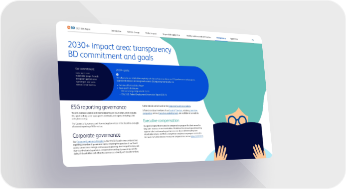 76 2021 ESG Report Healthy workforce and communities Appendices Responsible supply chain Product impact Climate change Introduction Transparency Our commitment: Invite trust across stakeholder groups through transparent performance reporting on ESG issues relevant to our business 2030+ goals: 1 We will provide our stakeholders regularly with clear information about our ESG performance and programs, aligned with relevant and recognized external ESG reporting frameworks, via: • Our annual Sust ainability Report • Issue-specific disclosur es – Climat e Change (aligned with TCFD) – ID&E ( U.S. Federal Employment Information Report [EEO-1]) ESG reporting governance The ERC oversees external and internal reporting on ESG matters, which includes this report and any other issue-specific disclosures and reports (including ID&E and cybersecurity). The Corporate Governance and Nominating Committee of the Board has oversight of external reporting of ESG matters. Corporate governance Our Corporate Governance Principles outline the BD Board’s views and practices regarding a number of governance topics, including the operation of our Board and its committees; strategic and succession planning; director qualifications and diversity; director independence, compensation and equity ownership; and the ability of shareholders and others to communicate directly with Board members. Further details can be found on the Corporate Governance website . Information about members of our Board of Directors , including committee composition and our Executive Leadership team , are available on our website. Executive compensation Our goal is to provide an executive compensation program that best serves the long-term interests of our shareholders. We believe that attracting and retaining superior talent and rewarding performance are key to delivering long-term shareholder returns, and that a competitive compensation program is critical to that end. For further details of executive compensation, see our proxy statements . 2030+ impact area: transparency BD commitment and goals